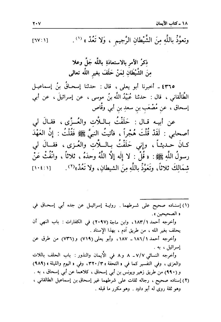4365 - أَخْبَرَنَا أَبُو يَعْلَى، قَالَ: حَدَّثَنَا إِسْحَاقُ بْنُ إِسْمَاعِيلَ الطَّالَقَانِيُّ، قَالَ: حَدَّثَنَا عُبَيْدُ اللَّهِ بْنُ مُوسَى، عَنْ إِسْرَائِيلَ، عَنْ أَبِي إِسْحَاقَ، عَنْ مُصْعَبِ بْنِ سَعْدِ بْنِ أَبِي وَقَّاصٍ عَنْ أَبِيهِ قَالَ: حَلَفْتُ بِاللَّاتِ وَالْعُزَّى، فَقَالَ لِي أَصْحَابِي: لَقَدْ قُلْتَ هُجْرًا، فَأَتَيْتُ النَّبِيَّ صَلَّى اللَّهُ عَلَيْهِ وَسَلَّمَ فَقُلْتُ: إِنَّ الْعَهْدَ كَانَ حَدِيثًا، وَإِنِّي حَلَفْتُ بِاللَّاتِ وَالْعُزَّى، فَقَالَ لِي رَسُولُ اللَّهِ صَلَّى اللَّهُ عَلَيْهِ وَسَلَّمَ: "قُلْ لَا إِلَهَ إِلَّا اللَّهُ وَحْدَهُ، ثَلَاثًا، وَانْفُثْ عَنْ شِمَالِكَ ثَلَاثًا، وَتَعَوَّذْ بِاللَّهِ مِنَ الشَّيْطَانِ، وَلَا تعد" 1.