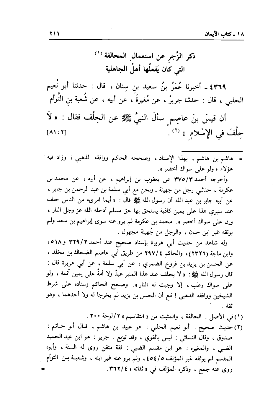 4369 - أَخْبَرَنَا عُمَرُ بْنُ سَعِيدِ بْنِ سِنَانٍ، قَالَ: حَدَّثَنَا أَبُو نُعَيْمٍ الْحَلَبِيُّ، قَالَ: حَدَّثَنَا جَرِيرٌ، عَنْ مُغِيرَةَ، عَنْ أَبِيهِ، عَنْ شُعْبَةَ بْنِ التَّوْأَمِ أَنَّ قَيْسَ بْنَ عَاصِمٍ سَأَلَ النَّبِيَّ صَلَّى اللَّهُ عَلَيْهِ وَسَلَّمَ عَنِ الْحِلْفِ فَقَالَ: "لَا حِلْفَ فِي الْإِسْلَامِ" 2.