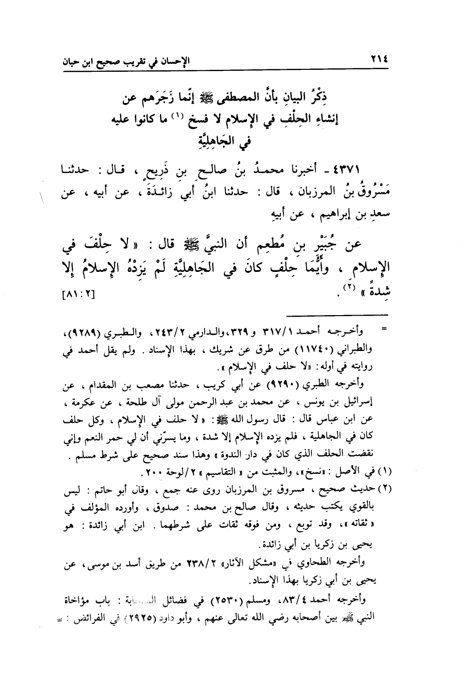 4371 - أَخْبَرَنَا مُحَمَّدُ بْنُ صَالِحِ بْنِ ذَرِيحٍ، قَالَ: حَدَّثَنَا مَسْرُوقُ بْنُ الْمَرْزُبَانِ، قَالَ: حَدَّثَنَا ابْنُ أَبِي زَائِدَةَ، عَنْ أَبِيهِ، عَنْ سَعْدِ بْنِ إِبْرَاهِيمَ، عَنْ أَبِيهِ عَنْ جُبَيْرِ بْنِ مُطْعِمٍ أَنَّ النَّبِيَّ صَلَّى اللَّهُ عَلَيْهِ وَسَلَّمَ قَالَ: "لَا حِلْفَ فِي الْإِسْلَامِ، وَأَيُّمَا حِلْفٍ كَانَ فِي الْجَاهِلِيَّةِ لَمْ يَزِدْهُ الْإِسْلَامُ إِلَّا شدة" 2.