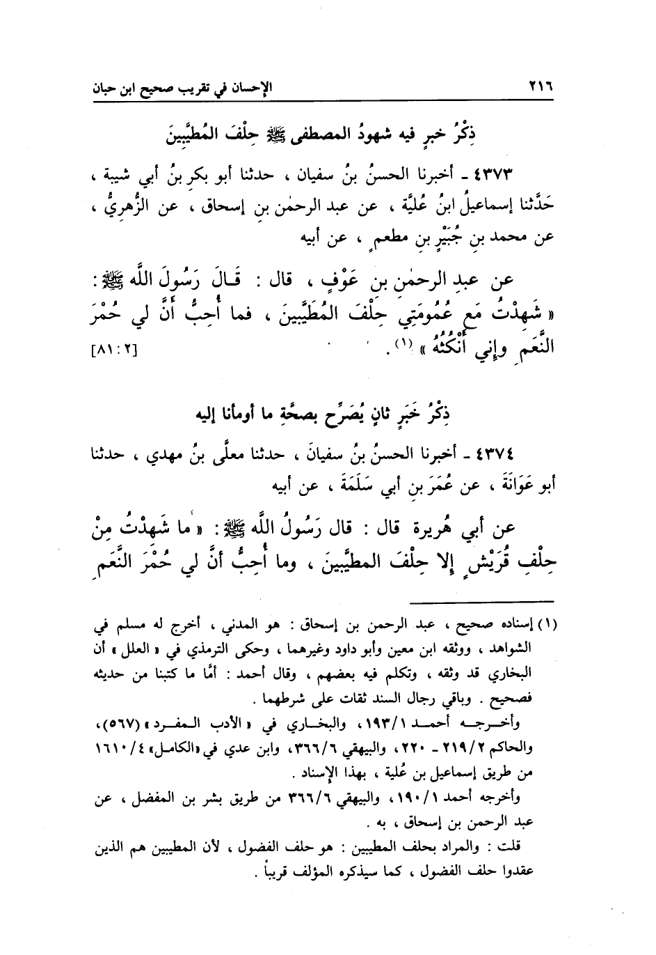 4373 - أَخْبَرَنَا الْحَسَنُ بْنُ سُفْيَانَ، حَدَّثَنَا أَبُو بَكْرِ بْنُ أَبِي شَيْبَةَ، حَدَّثَنَا إِسْمَاعِيلُ بْنُ عُلَيَّةَ، عَنْ عَبْدِ الرَّحْمَنِ بْنِ إِسْحَاقَ، عَنِ الزُّهْرِيِّ، عَنْ مُحَمَّدِ بْنِ جُبَيْرِ بْنِ مُطْعِمٍ، عَنْ أَبِيهِ عَنْ عَبْدِ الرَّحْمَنِ بْنِ عَوْفٍ، قَالَ: قَالَ رَسُولُ اللَّهِ صَلَّى اللَّهُ عَلَيْهِ وَسَلَّمَ: "شَهِدْتُ مَعَ عُمُومَتِي حِلْفَ الْمُطَيَّبِينَ، فَمَا أُحِبُّ أَنَّ لِي حُمْرَ النَّعَمِ وَإِنِّي أَنْكُثُهُ"1.