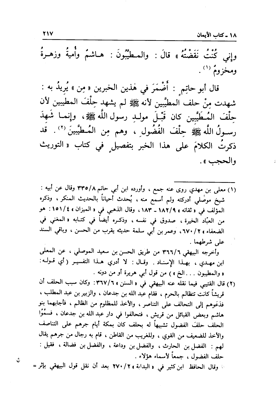 قَالَ أَبُو حَاتِمٍ: أَضْمَرَ فِي هَذَيْنِ الْخَبَرَيْنِ مَنْ يُرِيدُ بِهِ: شَهِدْتُ مِنْ حِلْفِ الْمُطَيَّبِينَ لِأَنَّهُ صَلَّى اللَّهُ عَلَيْهِ وَسَلَّمَ لَمْ يَشْهَدْ حِلْفَ الْمُطَيَّبِينَ لِأَنَّ حِلْفَ الْمُطَيَّبِينَ كَانَ قَبْلَ مَوْلِدِ رَسُولِ اللَّهِ صَلَّى اللَّهُ عَلَيْهِ وَسَلَّمَ، وَإِنَّمَا شَهِدَ رَسُولُ اللَّهِ صَلَّى اللَّهُ عَلَيْهِ وَسَلَّمَ حِلْفَ الْفُضُولِ، وَهُمْ مِنَ الْمُطَيَّبِينَ2. قَدْ ذَكَرْتُ الْكَلَامَ عَلَى هَذَا الْخَبَرِ بتفصيل في كتاب التوريث والحجب.
