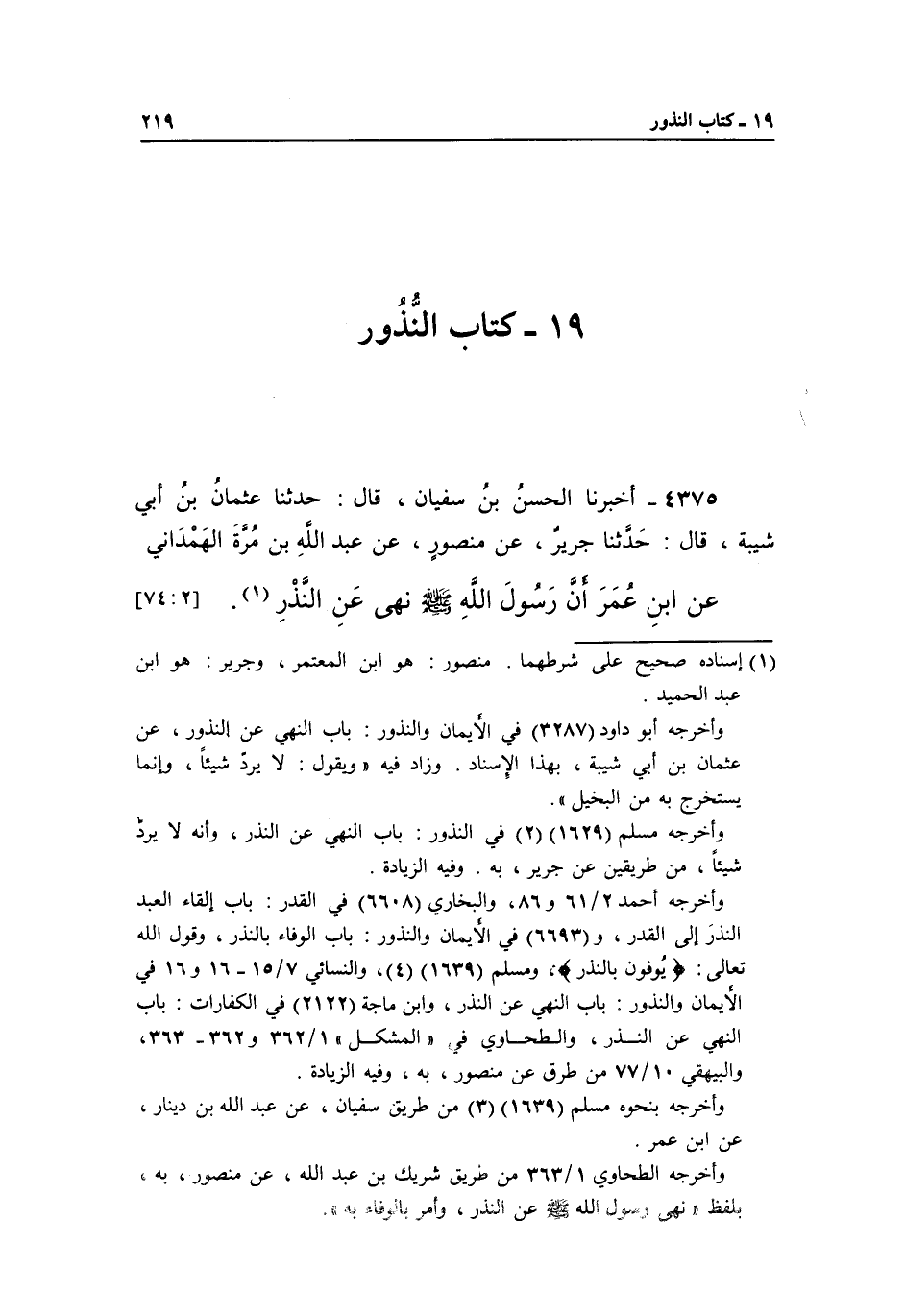 4375 - أَخْبَرَنَا الْحَسَنُ بْنُ سُفْيَانَ، قَالَ: حَدَّثَنَا عُثْمَانُ بْنُ أَبِي شَيْبَةَ، قَالَ: حَدَّثَنَا جَرِيرٌ، عَنْ مَنْصُورٍ، عَنْ عَبْدِ اللَّهِ بْنِ مُرَّةَ الْهَمْدَانِيِّ عَنِ ابْنِ عُمَرَ "أَنَّ رَسُولَ اللَّهِ صَلَّى الله عليه وسلم نهى عن النذر" 1.