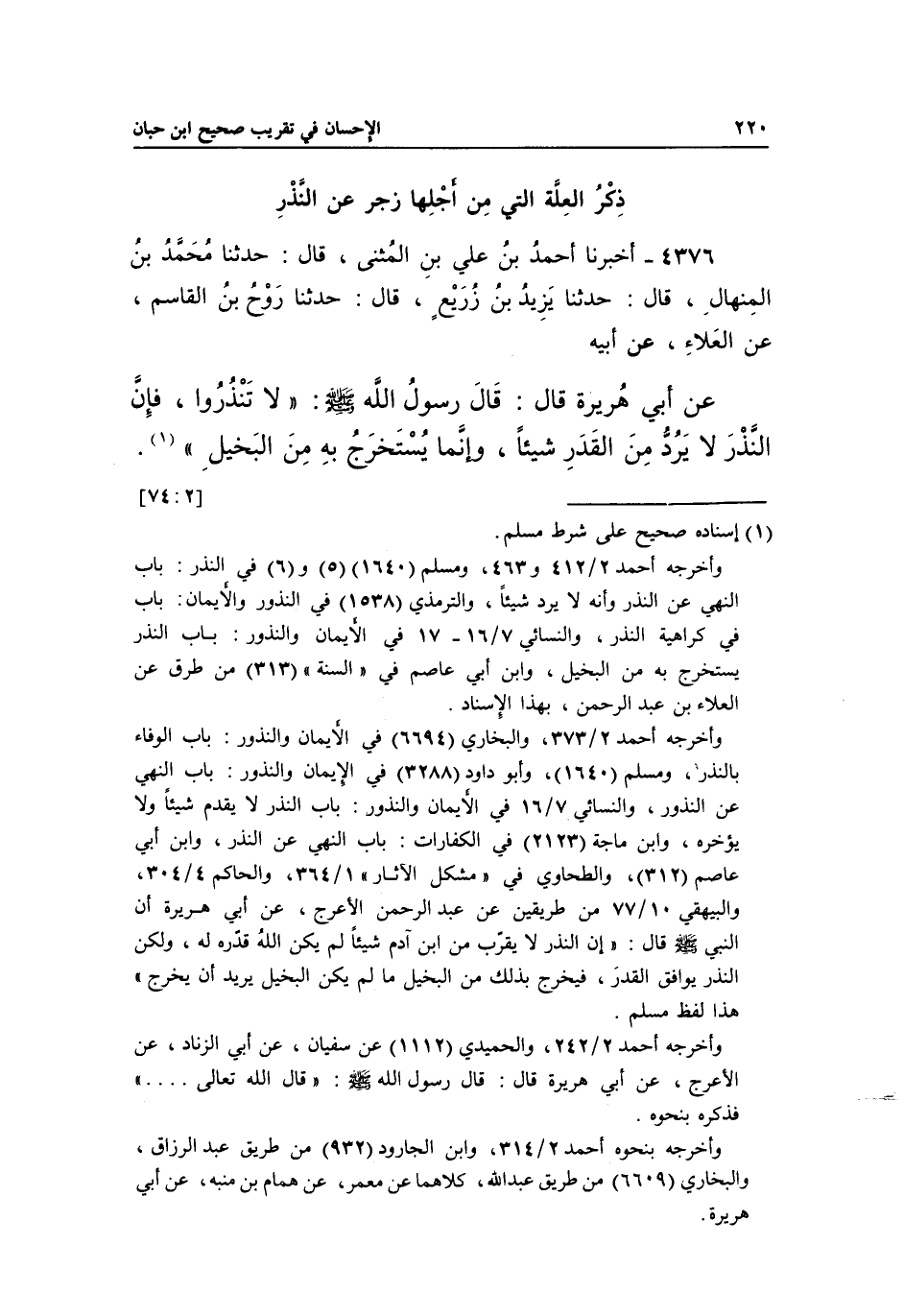 4376 - أَخْبَرَنَا أَحْمَدُ بْنُ عَلِيِّ بْنِ الْمُثَنَّى، قَالَ: حَدَّثَنَا مُحَمَّدُ بْنُ الْمِنْهَالِ، قَالَ: حَدَّثَنَا يَزِيدُ بْنُ زُرَيْعٍ، قَالَ: حَدَّثَنَا رَوْحُ بْنُ الْقَاسِمِ، عَنِ الْعَلَاءِ، عَنْ أَبِيهِ عَنْ أَبِي هُرَيْرَةَ قَالَ: قَالَ رَسُولُ اللَّهِ صَلَّى اللَّهُ عَلَيْهِ وَسَلَّمَ: "لَا تَنْذِرُوا، فَإِنَّ النَّذْرَ لَا يَرُدُّ مِنَ الْقَدْرِ شَيْئًا، وَإِنَّمَا يُسْتَخْرَجُ بِهِ من البخيل" 1.