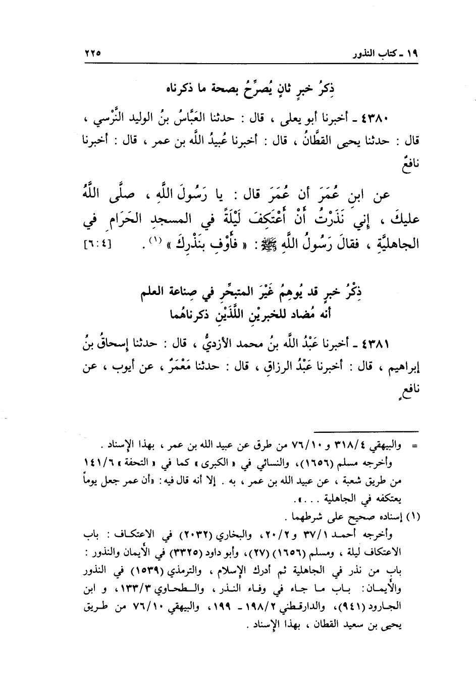 4380 - أَخْبَرَنَا أَبُو يَعْلَى، قَالَ: حَدَّثَنَا الْعَبَّاسُ بْنُ الْوَلِيدِ النَّرْسِيُّ، قَالَ: حَدَّثَنَا يَحْيَى الْقَطَّانُ، قَالَ: أَخْبَرَنَا عُبَيْدُ اللَّهِ بْنُ عُمَرَ، قَالَ أَخْبَرَنَا نافع عن ابن عمر أن عمر قال: يَا رَسُولَ اللَّهِ، صَلَّى اللَّهُ عَلَيْكَ، إِنِّي نَذَرْتُ أَنْ أَعْتَكِفَ لَيْلَةً فِي الْمَسْجِدِ الْحَرَامِ فِي الْجَاهِلِيَّةِ، فَقَالَ رَسُولُ اللَّهِ صَلَّى اللَّهُ عَلَيْهِ وَسَلَّمَ: "فأوف بنذرك" 1.