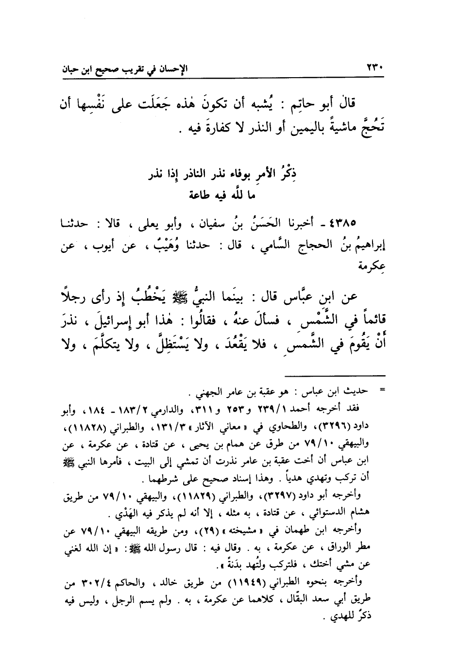4385 - أَخْبَرَنَا الْحَسَنُ بْنُ سُفْيَانَ، وَأَبُو يَعْلَى، قَالَا: حَدَّثَنَا إِبْرَاهِيمُ بْنُ الْحَجَّاجِ السَّامِيُّ، قَالَ: حَدَّثَنَا وُهَيْبٌ، عَنْ أَيُّوبَ، عَنْ عِكْرِمَةَ عَنِ ابْنِ عَبَّاسٍ قَالَ: بَيْنَمَا النَّبِيُّ صَلَّى اللَّهُ عَلَيْهِ وَسَلَّمَ يَخْطُبُ إِذْ رَأَى رَجُلًا قَائِمًا فِي الشَّمْسِ، فَسَأَلَ عَنْهُ، فَقَالُوا: هَذَا أَبُو إِسْرَائِيلَ، نَذَرَ أَنْ يَقُومَ فِي الشَّمْسِ، فَلَا يَقْعُدَ، وَلَا يَسْتَظِلُّ، وَلَا يتكلم، ولا