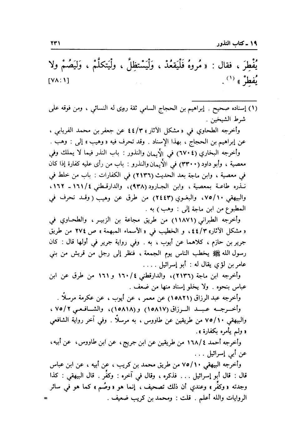 وأخرجه البيهقي 10/75 من طريق محمد بن كريب، عن أبيه، عن ابن عباس قال: قال أبو إسرائيل ... فذكره، وقال في آخره: وكفِّر، قال البيهقي: كذا وجدته وكفِّّر وعندي أن ذلك تصحيف، إنما هو وصُم كما هو في سائر الروايات والله أعلم. قلت: ومحمد بن كريب ضعيف. . . . . . . . . . . . . . . . . . . . . . . . . . . . . . . . . .=