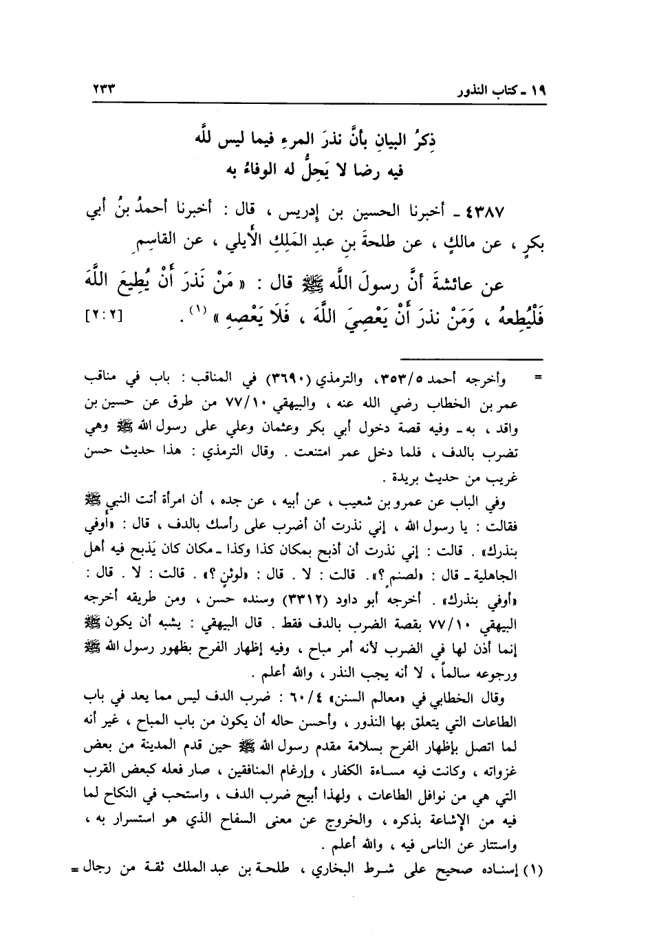 4387 - أَخْبَرَنَا الْحُسَيْنُ بْنُ إِدْرِيسَ، قَالَ: أَخْبَرَنَا أَحْمَدُ بْنُ أَبِي بَكْرٍ، عَنْ مالك، عن طَلْحَةَ بْنِ عَبْدِ الْمَلِكِ، الْأَيْلِيِّ عَنِ الْقَاسِمِ عَنْ عَائِشَةَ أَنَّ رَسُولَ اللَّهِ صَلَّى اللَّهُ عَلَيْهِ وَسَلَّمَ قَالَ: "مَنْ نَذَرَ أَنْ يُطِيعَ اللَّهَ فَلْيُطِعْهُ، وَمَنْ نَذَرَ أَنْ يَعْصِيَ اللَّهَ، فلا يعصه" 1.