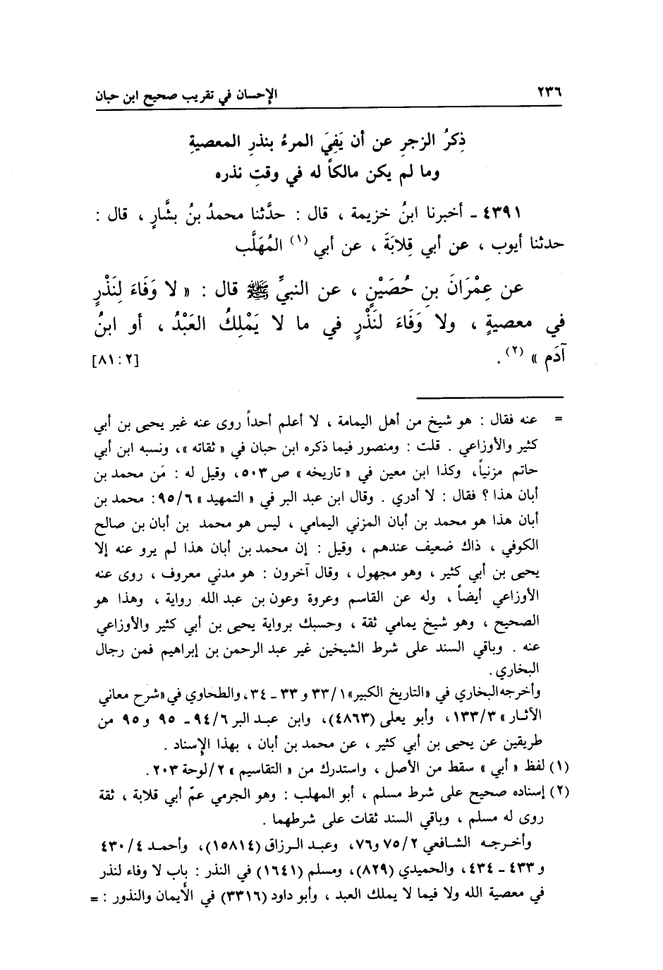 4391 - أخبرنا بْنِ خُزَيْمَةَ، قَالَ: حَدَّثَنَا مُحَمَّدُ بْنُ بَشَّارٍ، قَالَ: حدثا عَبْدُ الْوَهَّابِ الثَّقَفِيُّ، قَالَ: حَدَّثَنَا أَيُّوبُ، عَنْ أَبِي قِلَابَةَ، عَنْ أَبِي1 الْمُهَلَّبِ عَنْ عِمْرَانَ بْنِ حُصَيْنٍ، عَنِ النَّبِيِّ صَلَّى اللَّهُ عَلَيْهِ وَسَلَّمَ قَالَ: "لا وَفَاءَ لِنَذْرٍ فِي مَعْصِيَةٍ، وَلَا وَفَاءَ لِنَذْرٍ في ما لا يملك العبد، أو بن آدم"2.