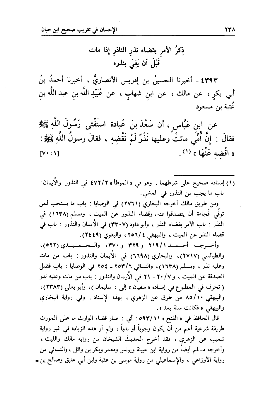 4393 - أَخْبَرَنَا الْحُسَيْنُ بْنُ إِدْرِيسَ الْأَنْصَارِيُّ، أَخْبَرَنَا أَحْمَدُ بْنُ أَبِي بَكْرٍ، عَنْ مَالِكٍ، عَنِ ابْنِ شِهَابٍ، عَنْ عُبَيْدِ اللَّهِ بْنِ عَبْدِ اللَّهِ بْنِ عُتْبَةَ بْنِ مَسْعُودٍ عَنِ ابْنِ عَبَّاسٍ، أَنَّ سَعْدَ بْنَ عُبَادَةَ اسْتَفْتَى رَسُولَ اللَّهِ صَلَّى اللَّهُ عَلَيْهِ وَسَلَّمَ فَقَالَ: إِنَّ أُمِّي مَاتَتْ وَعَلَيْهَا نَذَرٌ لَمْ تَقْضِهِ، فَقَالَ رَسُولُ اللَّهِ صَلَّى اللَّهُ عَلَيْهِ وَسَلَّمَ: "اقضه عنها" 1.