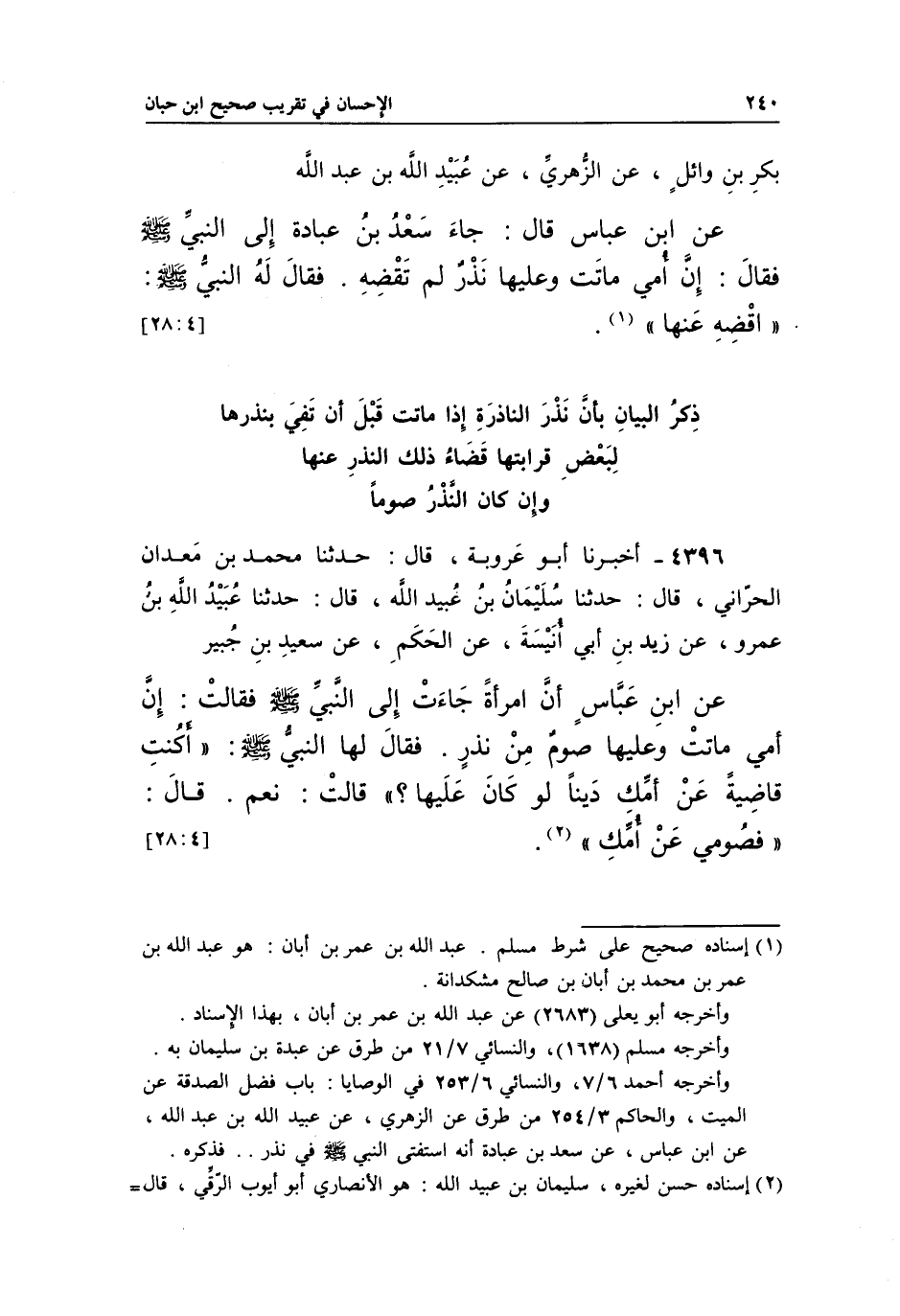 بَكْرِ بْنِ وَائِلٍ، عَنِ الزُّهْرِيِّ، عَنْ عُبَيْدِ اللَّهِ بْنِ عَبْدِ اللَّهِ عَنِ ابْنِ عَبَّاسٍ قَالَ: جَاءَ سَعْدُ بْنُ عُبَادَةَ إِلَى النَّبِيِّ صَلَّى اللَّهُ عَلَيْهِ وَسَلَّمَ فَقَالَ: إِنَّ أُمِّي مَاتَتْ وَعَلَيْهَا نَذَرٌ لَمْ تَقْضِهِ، فَقَالَ لَهُ النَّبِيُّ صَلَّى اللَّهُ عَلَيْهِ وَسَلَّمَ: "اقْضِهِ عَنْهَا"1.