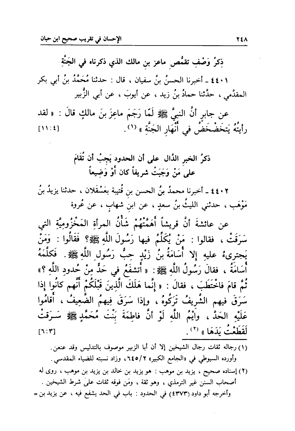 4401 - أَخْبَرَنَا الْحَسَنُ بْنُ سُفْيَانَ، قَالَ: حَدَّثَنَا مُحَمَّدُ بْنُ أَبِي بَكْرٍ الْمُقَدَّمِيُّ، حَدَّثَنَا حَمَّادُ بْنُ زَيْدٍ، عَنْ أَيُّوبَ، عَنْ أَبِي الزُّبَيْرِ عَنْ جَابِرٍ أَنَّ النَّبِيَّ صَلَّى اللَّهُ عَلَيْهِ وَسَلَّمَ لَمَّا رَجَمَ مَاعِزَ بْنَ مَالِكٍ قَالَ: "لَقَدْ رَأَيْتُهُ يَتَخَضْخَضُ فِي أَنْهَارِ الجنة" 1.