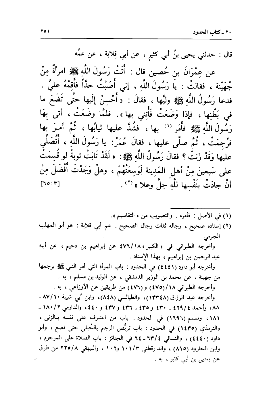 قَالَ: حَدَّثَنِي يَحْيَى بْنُ أَبِي كَثِيرٍ، عَنْ أَبِي قِلَابَةَ، عَنْ عَمِّهِ عَنْ عِمْرَانَ بْنِ حُصَيْنٍ قَالَ: أَتَتْ رَسُولِ اللَّهِ صَلَّى اللَّهُ عَلَيْهِ وَسَلَّمَ امْرَأَةٌ مِنْ جُهَيْنَةَ فَقَالَتْ: يَا رَسُولَ اللَّهِ، إِنِّي أَصَبْتُ حَدًّا فَأَقِمْهُ عَلَيَّ. فَدَعَا رَسُولُ اللَّهِ صَلَّى اللَّهُ عَلَيْهِ وَسَلَّمَ وَلِيِّهَا، فَقَالَ: "أَحْسِنْ إِلَيْهَا حَتَّى تَضَعَ مَا فِي بَطْنِهَا، فَإِذَا وَضَعَتْ فَأْتِنِي بِهَا". فَلَمَّا وَضَعَتْ، أَتَى بِهَا رَسُولِ اللَّهِ صَلَّى اللَّهُ عَلَيْهِ وَسَلَّمَ فَأَمَرَ1 بِهَا فَشُدَّ عَلَيْهَا ثِيَابُهَا، ثُمَّ أَمَرَ بِهَا فَرُجِمَتْ، ثُمَّ صَلَّى عَلَيْهَا، فَقَالَ عُمَرُ: يَا رَسُولَ اللَّهِ، أَتُصَلِّي عَلَيْهَا وَقَدْ زَنَتْ؟ فَقَالَ رَسُولُ اللَّهِ صَلَّى اللَّهُ عَلَيْهِ وَسَلَّمَ: "لَقَدْ تَابَتْ تَوْبَةً لَوْ قُسِمَتْ عَلَى سَبْعِينَ مِنْ أَهْلِ الْمَدِينَةِ لَوَسِعَتْهُمْ، وَهَلْ وَجَدْتَ أَفْضَلَ مِنْ أَنْ جَادَتْ بِنَفْسِهَا لِلَّهِ جل وعلا" 2.