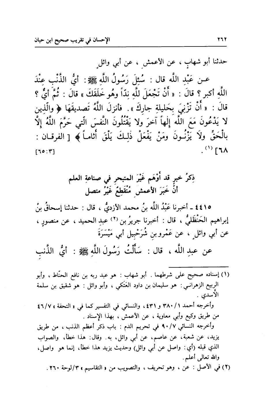 حَدَّثَنَا أَبُو شِهَابٍ، عَنِ الْأَعْمَشِ، عَنْ أَبِي وَائِلٍ عَنْ عَبْدِ اللَّهِ قَالَ: سُئِلَ رَسُولُ اللَّهِ صَلَّى اللَّهُ عَلَيْهِ وَسَلَّمَ: أَيُّ الذَّنْبِ عِنْدَ اللَّهِ أَكْبَرُ؟ قَالَ: "أَنْ تَجْعَلَ لِلَّهِ نِدًّا وَهُوَ خَلَقَكَ" قَالَ: ثُمَّ أَيُّ؟ قَالَ: "أَنْ تَزْنِيَ بِحَلِيلَةِ جَارِكَ". فَأَنْزَلَ اللَّهُ تَصْدِيقَهَا {وَالَّذِينَ لَا يَدْعُونَ مَعَ اللَّهِ إِلَهاً آخَرَ وَلا يَقْتُلُونَ النَّفْسَ الَّتِي حَرَّمَ اللَّهُ إِلَّا بِالْحَقِّ وَلا يَزْنُونَ وَمَنْ يَفْعَلْ ذَلِكَ يَلْقَ أَثَاماً} [الفرقان:68] 1.