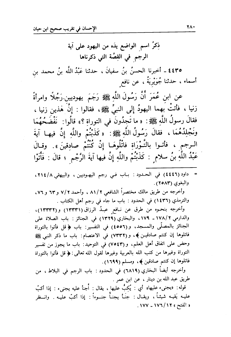 4435 - أَخْبَرَنَا الْحَسَنُ بْنُ سُفْيَانَ، حَدَّثَنَا عَبْدُ اللَّهِ بْنُ مُحَمَّدِ بْنِ أَسْمَاءَ، حَدَّثَنَا جُوَيْرِيَةُ، عَنْ نَافِعٍ عَنِ ابْنِ عُمَرَ أَنَّ رَسُولَ اللَّهِ صَلَّى اللَّهُ عَلَيْهِ وَسَلَّمَ رَجَمَ يَهُودِيَّيْنِ رَجُلًا وَامْرَأَةً زَنَيَا، فَأَتَتْ بِهِمَا الْيَهُودُ إِلَى النَّبِيِّ صَلَّى اللَّهُ عَلَيْهِ وَسَلَّمَ، فَقَالُوا: إِنَّ هَذَيْنِ زَنَيَا، فَقَالَ رَسُولُ اللَّهِ صَلَّى اللَّهُ عَلَيْهِ وَسَلَّمَ: "مَا تَجِدُونَ فِي التَّوْرَاةِ؟ " قَالُوا: نَفْضَحْهُمَا وَنَجْلِدُهُمَا، فَقَالَ رَسُولُ اللَّهِ صَلَّى اللَّهُ عَلَيْهِ وَسَلَّمَ: "كَذَبْتُمْ وَاللَّهِ إِنَّ فِيهَا آيَةَ الرَّجْمِ، فَأَتَوْا بِالتَّوْرَاةِ فَاتْلُوهَا إِنْ كُنْتُمْ صَادِقِينَ". وَقَالَ عَبْدُ اللَّهِ بْنُ سَلَّامٍ: كَذَبْتُمْ وَاللَّهِ إِنَّ فِيهَا آيَةَ الرَّجْمِ، قَالَ: فَأَتَوْا
