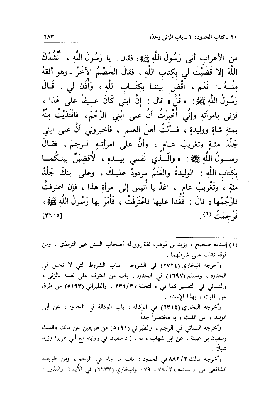 مِنَ الْأَعْرَابِ أَتَى رَسُولَ اللَّهِ صَلَّى اللَّهُ عَلَيْهِ وَسَلَّمَ، فَقَالَ: يَا رَسُولَ اللَّهِ، أُنْشِدُكَ اللَّهَ إِلَّا قَضَيْتَ لِي بِكِتَابِ اللَّهِ، فَقَالَ الْخَصْمُ الْآخَرُ -وَهُوَ أَفْقَهُ مِنْهُ-: نَعَمْ، اقْضِ بَيْنَنَا بِكِتَابِ اللَّهِ، وَأَذَنْ لِي، قَالَ رَسُولُ اللَّهِ صَلَّى اللَّهُ عَلَيْهِ وَسَلَّمَ: "قُلْ"، قَالَ: إِنَّ ابْنِي كَانَ عَسِيفًا عَلَى هَذَا، فَزَنَى بِامْرَأَتِهِ وَإِنِّي أُخْبِرْتُ أَنَّ عَلَى ابْنِي الرَّجْمُ، فَافْتَدَيْتُ مِنْهُ بِمِئَةِ شَاةٍ وَوَلِيدَةٍ، فَسَأَلْتُ أَهْلَ الْعِلْمِ، فَأَخْبَرُونِي أَنَّ عَلَى ابْنِي جَلْدُ مِائَةٍ وَتَغْرِيبُ عَامٍ، وَأَنَّ عَلَى امْرَأَتِهِ الرَّجْمُ، فَقَالَ رَسُولُ اللَّهِ صَلَّى اللَّهُ عَلَيْهِ وَسَلَّمَ: "وَالَّذِي نَفْسِي بِيَدِهِ، لَأَقْضِيَنَّ بَيْنَكُمَا بِكِتَابِ اللَّهِ: الْوَلِيدَةُ وَالْغَنَمُ مَرْدُودٌ عَلَيْكَ، وَعَلَى ابْنِكَ جَلْدُ مِائَةٍ، وَتَغْرِيبُ عَامٍ، اغْدُ يَا أُنَيْسُ إِلَى امْرَأَةِ هَذَا، فَإِنِ اعْتَرَفَتْ فَارْجُمْهَا" قَالَ: فَغَدَا عَلَيْهَا فَاعْتَرَفَتْ، فَأَمَرَ بِهَا رَسُولَ اللَّهِ صَلَّى اللَّهُ عَلَيْهِ وَسَلَّمَ، فرجمت1.