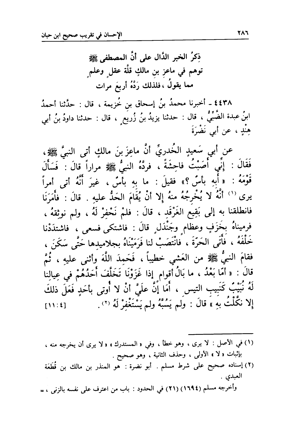 4438 - أَخْبَرَنَا مُحَمَّدُ بْنُ إِسْحَاقَ بْنِ خُزَيْمَةَ، قَالَ: حَدَّثَنَا أَحْمَدُ بْنُ عَبْدَةَ الضَّبِّيُّ، قَالَ: حَدَّثَنَا يَزِيدُ بْنُ زُرَيْعٍ، قَالَ: حَدَّثَنَا دَاوُدُ بْنُ أَبِي هِنْدٍ، عَنْ أَبِي نَضْرَةَ عَنْ أَبِي سَعِيدٍ الْخُدْرِيِّ، أَنَّ مَاعِزَ بْنَ مَالِكٍ أَتَى النَّبِيَّ صَلَّى اللَّهُ عَلَيْهِ وَسَلَّمَ، فَقَالَ: إِنِّي أَصَبْتُ فَاحِشَةً، فَرَدَّهُ النَّبِيُّ صَلَّى اللَّهُ عَلَيْهِ وَسَلَّمَ مِرَارًا قَالَ: فَسَأَلَ قَوْمَهُ: "أَبِهِ بَأْسٌ؟ " فَقِيلَ: مَا بِهِ بَأْسٌ، غَيْرَ أَنَّهُ أَتَى أَمْرًا يَرَى1 أَنَّهُ لَا يُخْرِجُهُ مِنْهُ إِلَّا أَنْ يُقَامَ الْحَدُّ عَلَيْهِ. قَالَ: فَأَمَرَنَا فَانْطَلَقْنَا بِهِ إِلَى بَقِيعِ الْغَرْقَدِ، قَالَ: فَلَمْ نَحْفُرْ لَهُ، وَلَمْ نُوثِقْهُ، فَرَمَيْنَاهُ بِخَزَفٍ وَعِظَامٍ وَجَنْدَلٍ قَالَ: فَاشْتَكَى فَسَعَى، فَاشْتَدَدْنَا خَلْفَهُ، فَأَتَى الْحَرَّةَ فَانْتَصَبَ لَنَا فَرَمَيْنَاهُ بِجَلَامِيدِهَا حَتَّى سَكَنَ، فَقَامَ النَّبِيُّ صَلَّى اللَّهُ عَلَيْهِ وَسَلَّمَ مِنَ الْعَشِيِّ خَطِيبًا، فَحَمِدَ اللَّهَ وَأَثْنَى عَلَيْهِ، ثُمَّ قَالَ: "أَمَّا بَعْدَ، ما بال أَقْوَامٍ إِذَا غَزَوْنَا تَخَلَّفَ أَحَدُهُمْ فِي عِيَالِنَا لَهُ نَبِيبٌ كَنَبِيبِ التَّيْسِ، أَمَا إِنَّ عَلَيَّ أَنْ لَا أُوتِيَ بِأَحَدٍ فَعَلَ ذَلِكَ إِلَّا نَكَّلْتُ بِهِ" قَالَ: وَلَمْ يَسُبَّهُ وَلَمْ يَسْتَغْفِرْ له2.