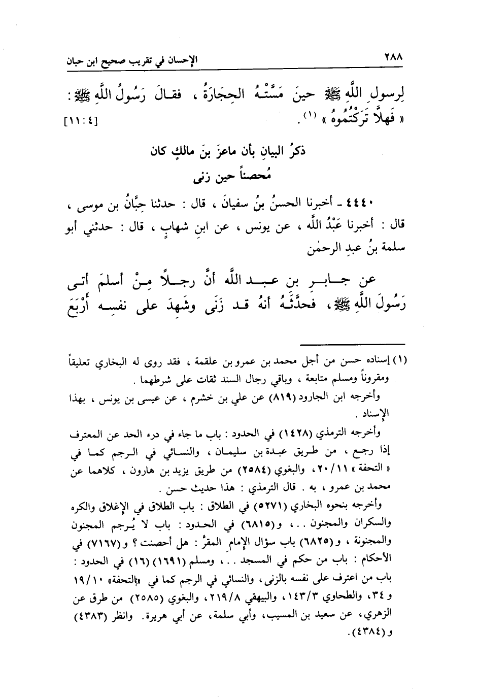 4440 - أَخْبَرَنَا الْحَسَنُ بْنُ سُفْيَانَ، قَالَ: حَدَّثَنَا حِبَّانُ بْنُ مُوسَى، قَالَ: أَخْبَرَنَا عَبْدُ اللَّهِ، عَنْ يونس، عن بن شِهَابٍ، قَالَ: حَدَّثَنِي أَبُو سَلَمَةَ بْنُ عَبْدِ الرَّحْمَنِ عَنْ جَابِرِ بْنِ عَبْدِ اللَّهِ أَنَّ رَجُلًا مِنْ أَسْلَمَ أَتَى رَسُولَ اللَّهِ صَلَّى اللَّهُ عَلَيْهِ وَسَلَّمَ، فَحَدَّثَهُ أَنَّهُ قَدْ زَنَى وَشَهِدَ عَلَى نَفْسِهِ أَرْبَعَ