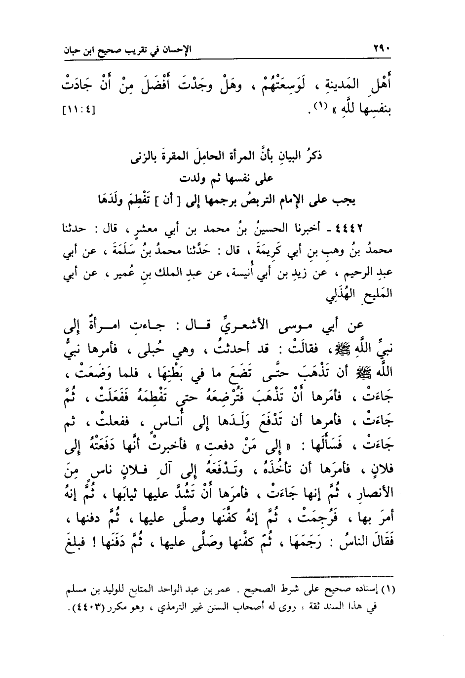 4442 - أَخْبَرَنَا الْحُسَيْنُ بْنُ مُحَمَّدِ بْنِ أَبِي مَعْشَرٍ، قَالَ: حَدَّثَنَا مُحَمَّدُ بْنُ وَهْبِ بْنِ أَبِي كَرِيمَةَ، قَالَ: حَدَّثَنَا مُحَمَّدُ بْنُ سَلَمَةَ، عَنْ أَبِي عَبْدِ الرَّحِيمِ، عَنْ زَيْدِ بْنِ أَبِي أُنَيْسَةَ، عَنْ عَبْدِ الْمَلِكِ بْنِ عُمَيْرٍ، عَنْ أَبِي الْمَلِيحِ الْهُذَلِيِّ عَنْ أَبِي مُوسَى الْأَشْعَرِيِّ قَالَ: جَاءَتِ امْرَأَةٌ إِلَى نَبِيِّ اللَّهِ صَلَّى اللَّهُ عَلَيْهِ وَسَلَّمَ، فَقَالَتْ: قَدْ أَحْدَثْتُ، وَهِيَ حُبْلَى، فَأَمَرَهَا نَبِيِّ اللَّهِ صَلَّى اللَّهُ عَلَيْهِ وَسَلَّمَ أَنَّ تَذْهَبَ حَتَّى تَضَعَ مَا فِي بَطْنِهَا، فَلَمَّا وَضَعَتْ، جَاءَتْ، فَأَمَرَهَا أَنْ تَذْهَبَ فَتُرْضِعَهُ حَتَّى تَفْطِمَهُ فَفَعَلَتْ، ثُمَّ جَاءَتْ، فَأَمَرَهَا أَنْ تَدْفَعَ وَلَدَهَا إِلَى أُنَاسٍ، فَفَعَلَتْ، ثُمَّ جَاءَتْ، فَسَأَلَهَا: "إِلَى مَنْ دَفَعَتْ"، فَأَخْبَرَتْ أَنَّهَا دَفَعْتُهُ إِلَى فُلَانٍ، فَأَمَرَهَا أَنْ تَأْخُذَهُ، وَتَدْفَعَهُ إِلَى آلِ فُلَانٍ نَاسٍ مِنَ الْأَنْصَارِ، ثُمَّ إِنَّهَا جَاءَتْ، فَأَمَرَهَا أَنْ تَشُدَّ عَلَيْهَا ثِيَابَهَا، ثُمَّ إِنَّهُ أَمَرَ بِهَا، فَرُجِمَتْ، ثُمَّ إِنَّهُ كَفَّنَهَا وَصَلَّى عَلَيْهَا، ثُمَّ دَفَنَهَا، فَقَالَ النَّاسُ: رَجَمَهَا ثُمَّ كَفَّنَهَا وَصَلَّى عَلَيْهَا، ثُمَّ دَفَنَهَا! فَبَلَغَ
