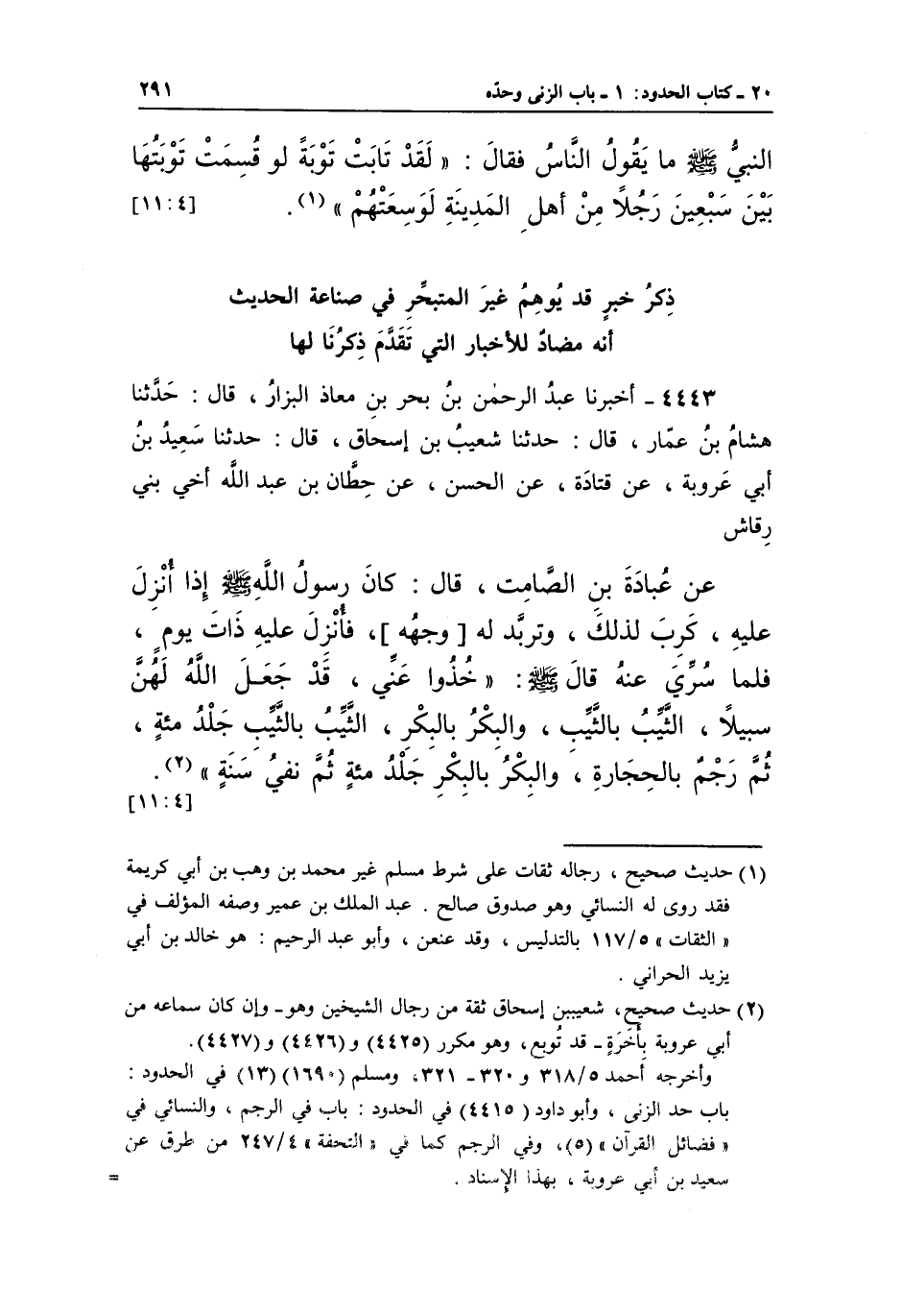 4443 - أَخْبَرَنَا عَبْدُ الرَّحْمَنِ بْنُ بَحْرِ بْنِ مُعَاذٍ الْبَزَّارُ، قَالَ: حَدَّثَنَا هِشَامُ بْنُ عَمَّارٍ، قَالَ: حَدَّثَنَا شُعَيْبُ بْنُ إِسْحَاقَ، قَالَ: حَدَّثَنَا سَعِيدُ بْنُ أَبِي عَرُوبَةَ، عَنْ قَتَادَةَ، عَنْ الْحَسَنِ، عَنْ حِطَّانَ بْنِ عَبْدِ اللَّهِ أَخِي بَنِي رَقَاشٍ عَنْ عُبَادَةَ بْنِ الصَّامِتِ، قَالَ: كَانَ رَسُولُ اللَّهِ صَلَّى اللَّهُ عَلَيْهِ وَسَلَّمَ إِذَا أُنْزِلَ عَلَيْهِ، كَرْبٌ لِذَلِكَ، وَتَرَبَّدَ لَهُ [وَجْهُهُ] ، فَأُنْزِلَ عَلَيْهِ ذَاتَ يَوْمٍ، فَلَمَّا سُرِّيَ عَنْهُ قَالَ صَلَّى اللَّهُ عَلَيْهِ وَسَلَّمَ: "خُذُوا عَنِّي، قَدْ جَعَلَ اللَّهُ لَهُنَّ سَبِيلًا، الثَّيِّبُ بِالثَّيِّبِ، وَالْبِكْرُ بِالْبِكْرِ، الثَّيِّبُ بِالثَّيِّبِ جَلْدُ مِائَةٍ، ثُمَّ رَجْمٌ بِالْحِجَارَةِ، وَالْبِكْرُ بِالْبِكْرِ جَلْدُ مائة ثم نفي سنة" 1.