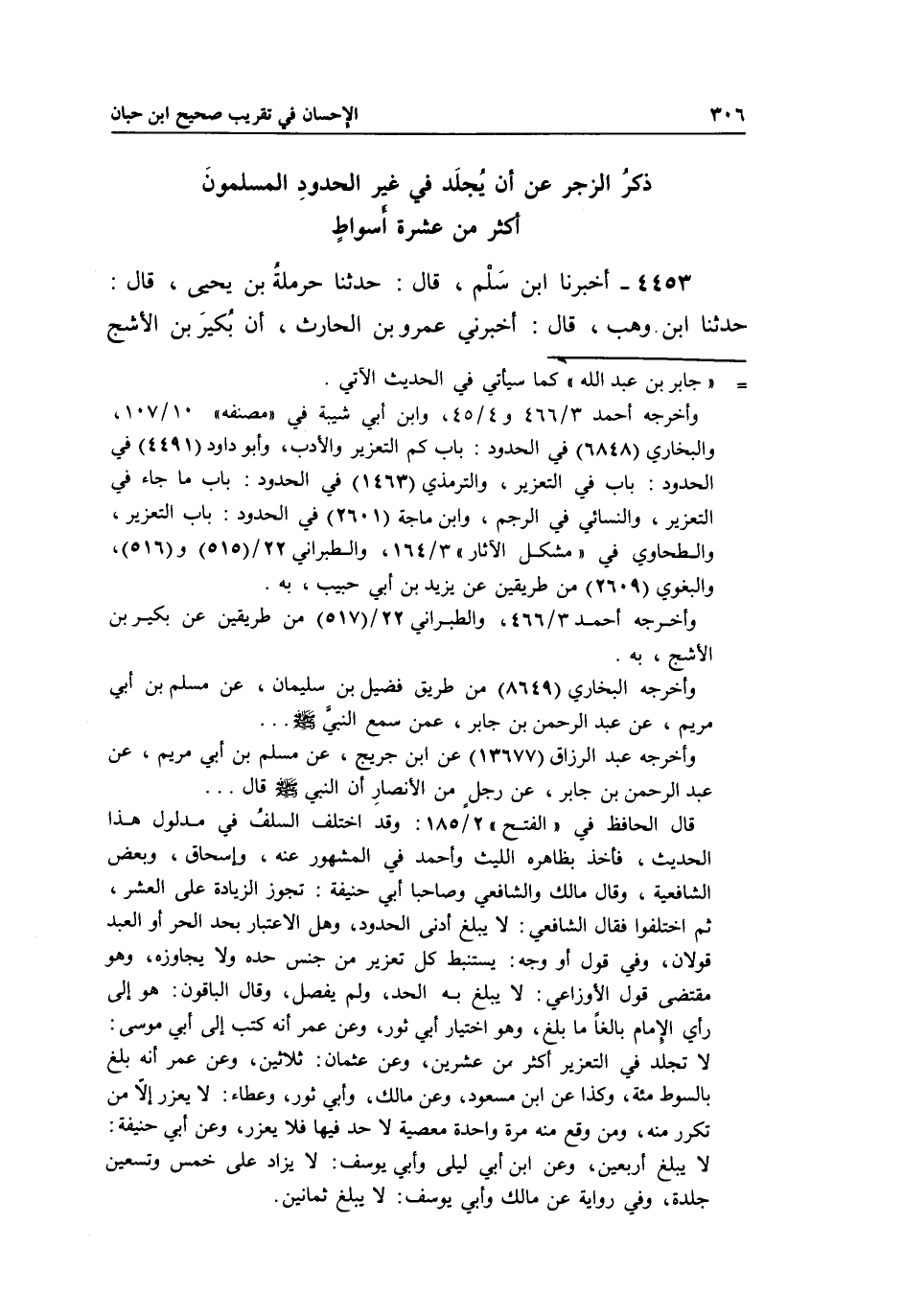 قال الحافظ في "الفتح" 2/185: وقد اختلف السلفُ في مدلول هذا الحديث، فأخذ بظاهره الليث وأحمد في المشهور عنه، وإسحاق، وبعض الشافعية، وقال مالك والشافعي وصاحبا أبي حنيفة: توز الزيادة على العشر، ثم اختلفوا فقال الشافعي: لا يبلغ أدنى الحدود، وهل الاعتبار بحد الحر أو العبد قولان، وفي قول أو وجه: يستنبط كل تعزير من جنس حده ولا يجاوزه، وهو مقتضى قول الأوزاعي: لا يبلغ به الحد، ولم يفصل، وقال الباقون: هو إلى رأي الإمام بالغاً ما بلغ، وهو اختيار أبي ثور، وعن عمر أنه كتب إلى أبي موسى: لا تجلد في التعزير أكثر من عشرين، وعن عثمان: ثلاثين، وعن عمر أنه بلغ بالسوط مئة، وكذا عن ابن مسعود، وعن مالك، وأبي ثور، وعطاء: لا يعزر إلا من تكرر منه، ومن وقع منه مرة واحدة معصية لا حد فيها فلا تعزير، وعن أبي حنيفة: لا يبلغ أربعين، وعن ابن أبي ليلة وأبي يوسف: لا يزاد على خمس وتسعين جلدة، وفي رواية عن مالك وأبي يوسف: لا يبلغ ثمانين.