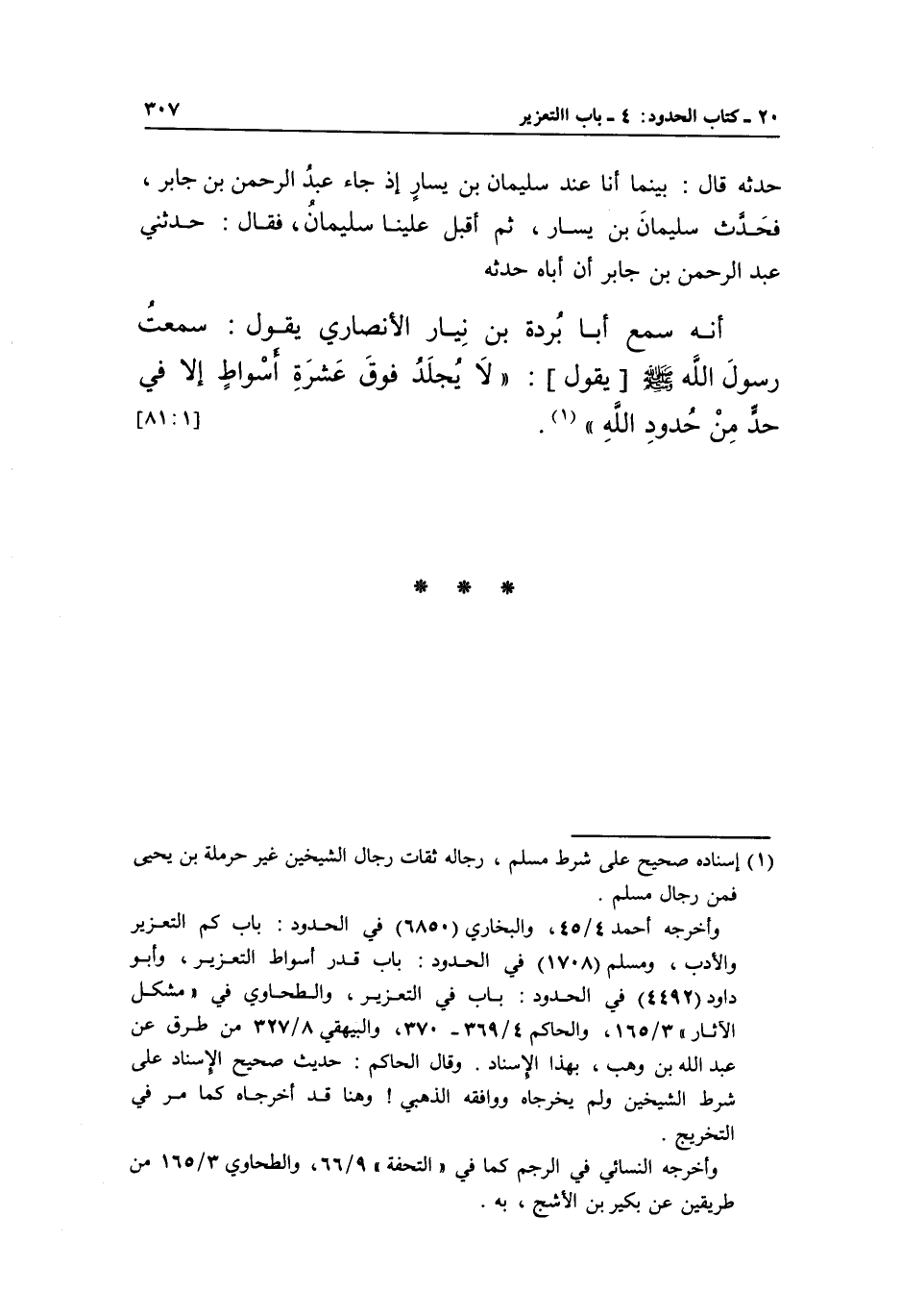 وأخرجه أحمد 4/45، والبخاري 6850 في الحدود: باب كم التعزير والأدب، ومسلم 1708 في الحدود: باب قدر أسواط التعزير، وأبو داود 4492 في الحدود: باب في التعزير، والطحاوي في "مشكل الآثار" 3/165، والحاكم 4/369-370، والبيهقي 8/327 من طرق عن عبد الله بن وهب، بهذا الإسناد. وقال الحاكم: حديث صحيح الإسناد على شرط الشيخين ولم يخرجاه ووافقه الذهبي! وهنا قد أخرجاه كما مر في التخريج.