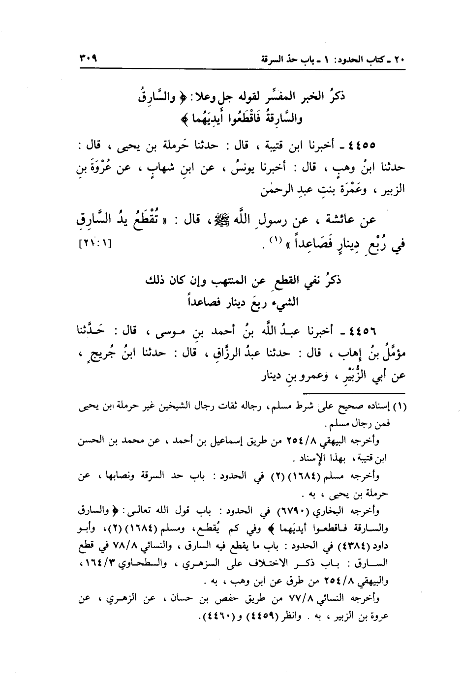4455 - أَخْبَرَنَا ابْنُ قُتَيْبَةَ، قَالَ: حَدَّثَنَا حَرْمَلَةُ بْنُ يَحْيَى، قَالَ: حَدَّثَنَا ابْنُ وَهْبٍ، قَالَ: أَخْبَرَنَا يُونُسُ، عَنِ ابْنِ شِهَابٍ، عَنْ عُرْوَةَ بْنِ الزُّبَيْرِ، وَعَمْرَةَ بِنْتِ عَبْدِ الرَّحْمَنِ عَنْ عَائِشَةَ، عَنْ رَسُولِ اللَّهِ صَلَّى اللَّهُ عَلَيْهِ وَسَلَّمَ قَالَ: "تُقْطَعُ يَدُ السَّارِقِ فِي رُبْعِ دِينَارٍ فصاعدا" 1.