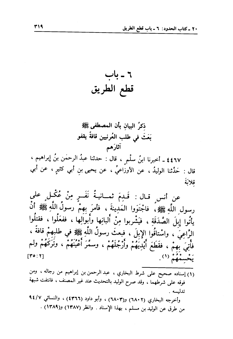 4467 - أَخْبَرَنَا ابْنُ سَلْمٍ، قَالَ: حَدَّثَنَا عَبْدُ الرَّحْمَنِ بْنُ إِبْرَاهِيمَ، قَالَ: حَدَّثَنَا الْوَلِيدُ، عَنِ الْأَوْزَاعِيُّ، عَنْ يَحْيَى بْنِ أَبِي كَثِيرٍ، عَنْ أَبِي قِلَابَةَ عَنْ أَنَسٍ قَالَ: قَدِمَ ثَمَانِيَةُ نَفَرٍ مِنْ عُكْلٍ عَلَى رَسُولِ اللَّهِ صَلَّى اللَّهُ عَلَيْهِ وَسَلَّمَ، فَاجْتَوَوَا الْمَدِينَةَ، فَأَمَرَ بِهِمْ رَسُولُ اللَّهِ صَلَّى اللَّهُ عَلَيْهِ وَسَلَّمَ أَنْ يَأْتُوا إِبِلَ الصَّدَقَةِ، فَيَشْرَبُوا مِنْ أَلْبَانِهَا وَأَبْوَالِهَا، فَفَعَلُوا، فَقَتَلُوا الرَّاعِيَ، وَاسْتَاقُوا الْإِبِلَ، فَبَعَثَ رَسُولُ اللَّهِ صَلَّى اللَّهُ عَلَيْهِ وَسَلَّمَ فِي طَلَبِهِمْ قَافَةً، فَأُتِيَ بِهِمْ، فَقَطَعَ أَيْدِيهِمْ وَأَرْجُلَهُمْ، وَسَمَرَ أَعْيُنَهُمْ، وَتَرَكَهُمْ وَلَمْ يَحْسِمْهُمْ1.