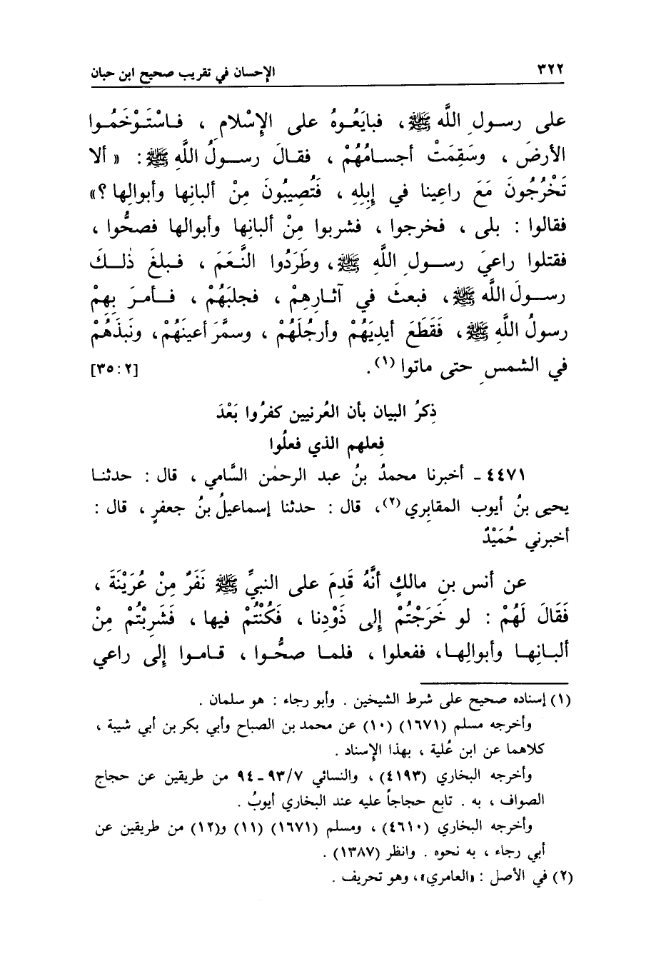 4471 - أَخْبَرَنَا مُحَمَّدُ بْنُ عَبْدِ الرَّحْمَنِ السَّامِيُّ، قَالَ: حَدَّثَنَا يَحْيَى بْنُ أَيُّوبَ الْمَقَابِرِيُّ1، قَالَ: حَدَّثَنَا إِسْمَاعِيلُ بْنُ جَعْفَرٍ، قَالَ: أَخْبَرَنِي حُمَيْدٌ عَنْ أَنَسِ بْنِ مَالِكٍ أَنَّهُ قَدِمَ عَلَى النَّبِيِّ صَلَّى اللَّهُ عَلَيْهِ وَسَلَّمَ نَفَرٌ مِنْ عُرَيْنَةَ، فَقَالَ لَهُمْ: لَوْ خَرَجْتُمْ إِلَى ذَوْدِنَا، فَكُنْتُمْ فِيهَا، فَشَرِبْتُمْ مِنْ أَلْبَانِهَا وَأَبْوَالِهَا، ففعلوا، فلما صحوا، قاموا إلى راعي