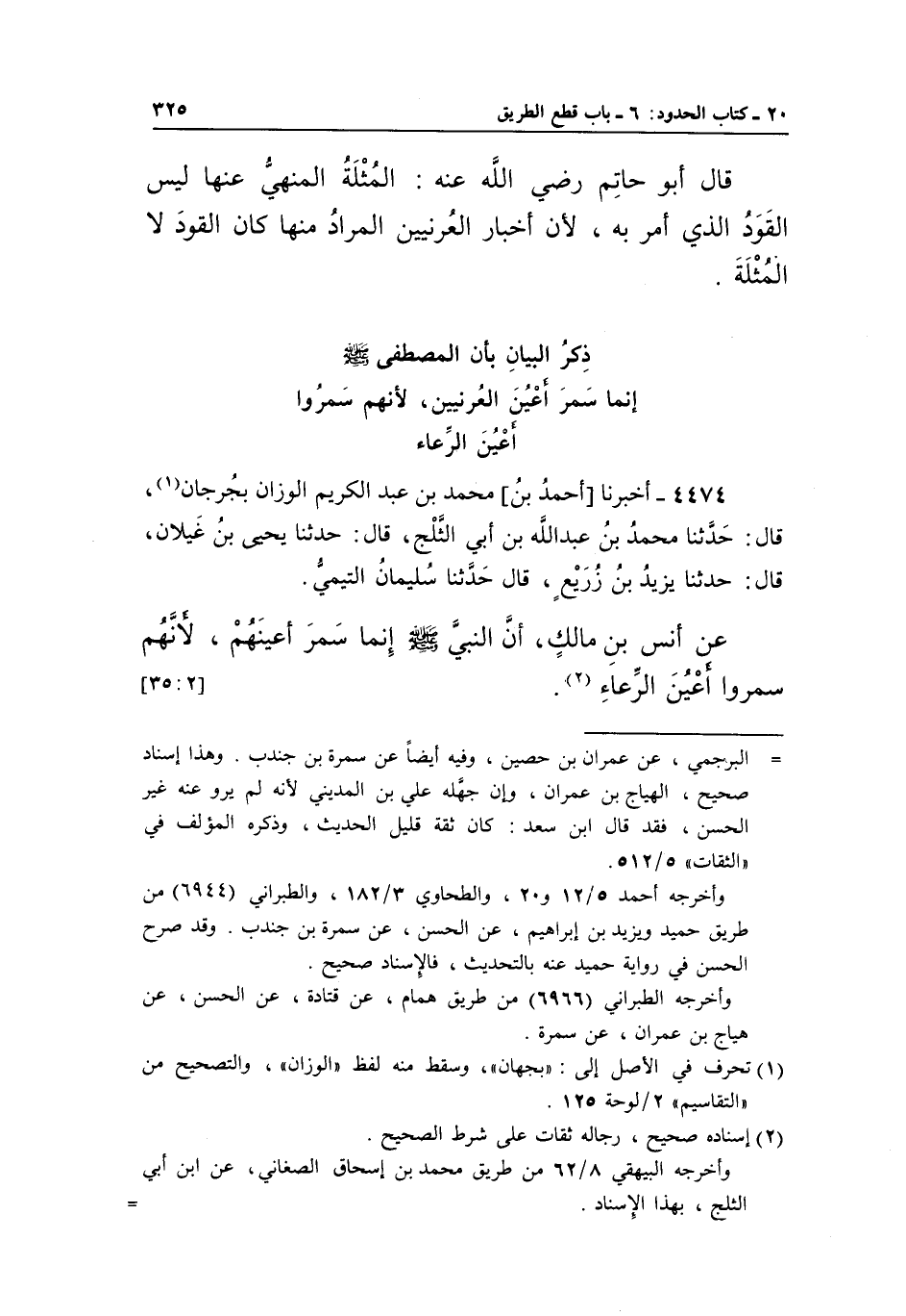 4474 - أَخْبَرَنَا [أَحْمَدُ بْنُ] مُحَمَّدِ بْنِ عَبْدِ الْكَرِيمِ الْوَزَّانُ بِجُرْجَانَ1، قَالَ: حَدَّثَنَا مُحَمَّدُ بْنُ عَبْدِ اللَّهِ بْنِ أَبِي الثَّلْجِ، قَالَ: حَدَّثَنَا يَحْيَى بْنُ غَيْلَانَ، قَالَ: حَدَّثَنَا يَزِيدُ بْنُ زُرَيْعٍ، قَالَ: حَدَّثَنَا سُلَيْمَانُ التَّيْمِيُّ عَنْ أَنَسِ بْنِ مَالِكٍ، أَنَّ النَّبِيَّ صَلَّى اللَّهُ عَلَيْهِ وَسَلَّمَ إِنَّمَا سَمَّرَ أَعْيُنَهُمْ، لِأَنَّهُمْ سَمَّرُوا أعين الرعاء2.