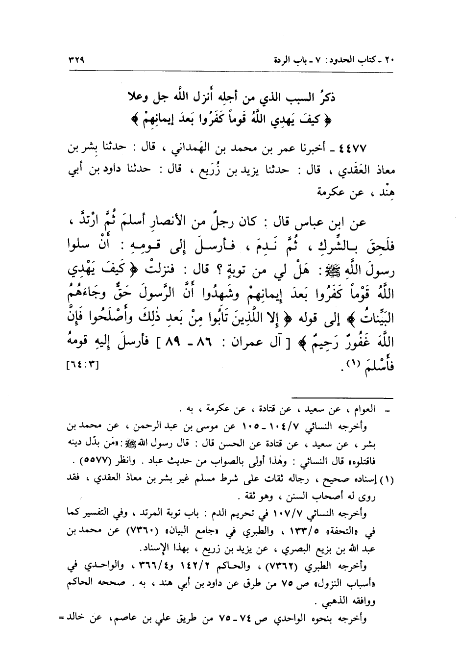 4477 - أَخْبَرَنَا عُمَرُ بْنُ مُحَمَّدِ بْنِ الْهَمْدَانِيُّ، قَالَ: حَدَّثَنَا بِشْرُ بْنُ مُعَاذٍ الْعَقَدِيُّ، قَالَ: حَدَّثَنَا يَزِيدُ بْنُ زُرَيْعٍ، قَالَ: حَدَّثَنَا دَاوُدُ بْنُ أَبِي هِنْدٍ، عَنْ عِكْرِمَةَ عَنِ ابْنِ عَبَّاسٍ قَالَ: كَانَ رَجُلٌ مِنَ الْأَنْصَارِ أَسْلَمَ ثُمَّ ارْتَدَّ، فَلَحِقَ بِالشِّرْكِ، ثُمَّ نَدِمَ، فَأَرْسَلَ إِلَى قَوْمِهِ: أَنْ سَلُوا رَسُولُ اللَّهِ صَلَّى اللَّهُ عَلَيْهِ وَسَلَّمَ: هَلْ لِي مِنْ تَوْبَةٍ؟ قَالَ: فَنَزَلَتْ {كَيْفَ يَهْدِي اللَّهُ قَوْماً كَفَرُوا بَعْدَ إِيمَانِهِمْ وَشَهِدُوا أَنَّ الرَّسُولَ حَقٌّ وَجَاءَهُمُ الْبَيِّنَاتُ} إِلَى قَوْلِهِ {إِلَّا الَّذِينَ تَابُوا مِنْ بَعْدِ ذَلِكَ وَأَصْلَحُوا فَإِنَّ اللَّهَ غَفُورٌ رَحِيمٌ} [آل عمران:89] فأرسل إليه قومه فأسلم1.