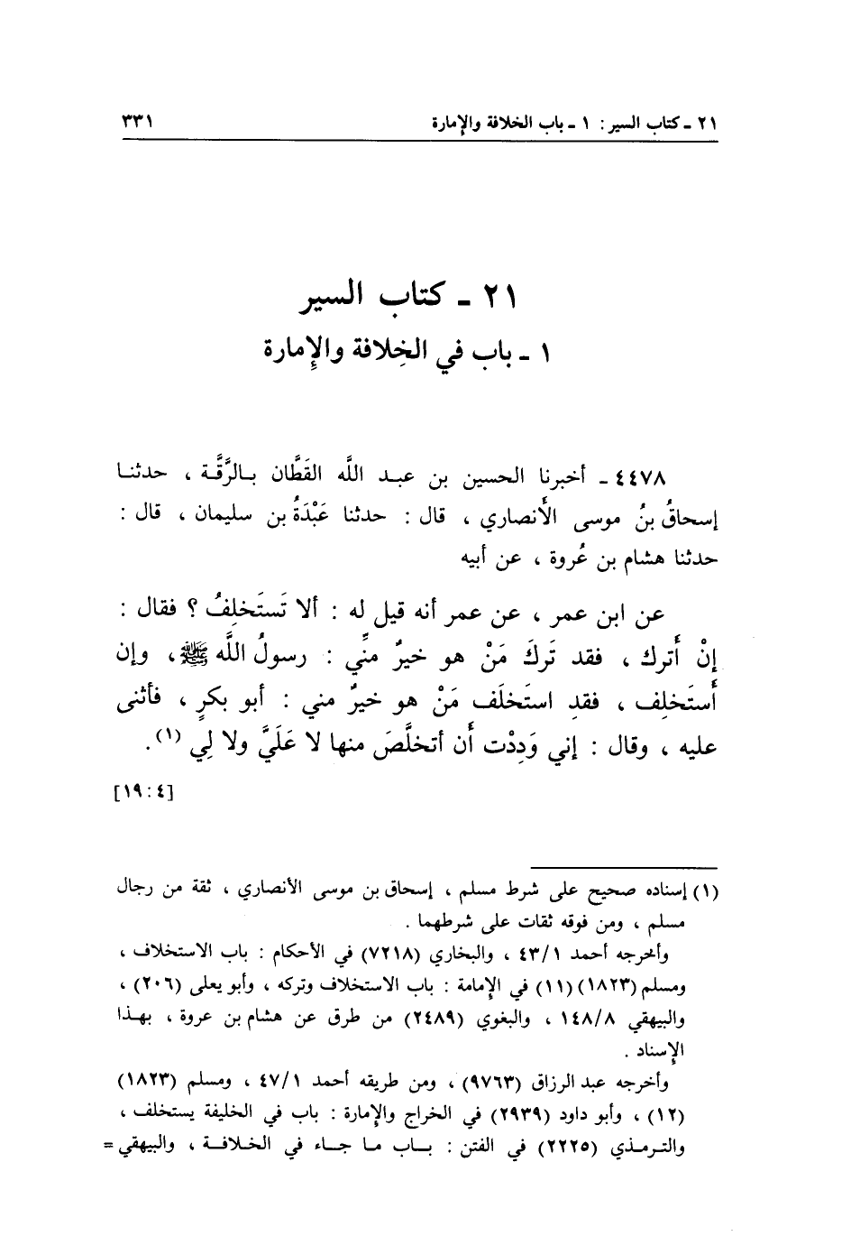 4478 - أَخْبَرَنَا الْحُسَيْنُ بْنُ عَبْدِ اللَّهِ الْقَطَّانُ بِالرَّقَّةِ، حَدَّثَنَا إِسْحَاقُ بْنُ مُوسَى الْأَنْصَارِيُّ، قَالَ: حَدَّثَنَا عَبْدَةُ بْنُ سُلَيْمَانَ، قَالَ: حَدَّثَنَا هِشَامُ بْنُ عُرْوَةَ، عَنْ أَبِيهِ عَنِ ابْنِ عُمَرَ، عَنِ عُمَرَ أَنَّهُ قِيلَ لَهُ: أَلَا تَسْتَخْلِفُ؟ فَقَالَ: إِنْ أَتْرُكْ، فَقَدْ تَرَكَ مَنْ هُوَ خَيْرٌ مِنِّي: رَسُولُ اللَّهِ صَلَّى اللَّهُ عَلَيْهِ وَسَلَّمَ، وَإِنَّ أَسْتَخْلِفْ، فَقَدِ اسْتَخْلَفَ مَنْ هُوَ خَيْرٌ مِنِّي: أَبُو بَكْرٍ، فَأَثْنَى عَلَيْهِ، وَقَالَ: إِنِّي وَدِدْتُ أَنْ أَتَخَلَّصَ مِنْهَا لَا عَلَيَّ وَلَا لِي1.