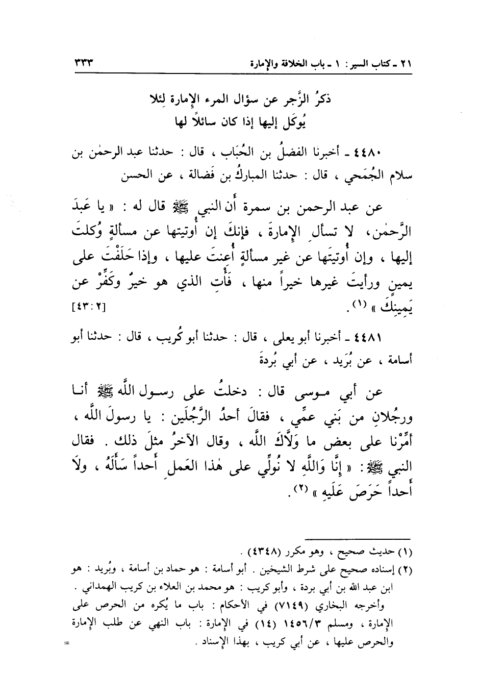 4480 - أَخْبَرَنَا الْفَضْلُ بْنُ الْحُبَابِ، قَالَ: حَدَّثَنَا عَبْدُ الرَّحْمَنِ بْنُ سَلَامٍ الْجُمَحِيُّ، قَالَ: حَدَّثَنَا الْمُبَارَكُ بْنُ فَضَالَةَ، عَنِ الْحَسَنِ عَنْ عَبْدِ الرَّحْمَنِ بْنِ سَمُرَةَ أَنَّ النَّبِيَّ صَلَّى اللَّهُ عَلَيْهِ وَسَلَّمَ قَالَ لَهُ: "يَا عَبْدَ الرَّحْمَنِ، لَا تَسْأَلِ الْإِمَارَةَ، فَإِنَّكَ إِنْ أُوتِيتَهَا عَنْ مَسْأَلَةٍ وُكِلْتَ إِلَيْهَا، وَإِنْ أُوتِيتَهَا عَنْ غَيْرِ مَسْأَلَةٍ أُعِنْتَ عَلَيْهَا، وَإِذَا حَلَفْتَ عَلَى يَمِينٍ وَرَأَيْتَ غَيْرَهَا خَيْرًا مِنْهَا، فَأْتِ الَّذِي هُوَ خَيْرٌ وَكَفِّرْ عن يمينك" 1.