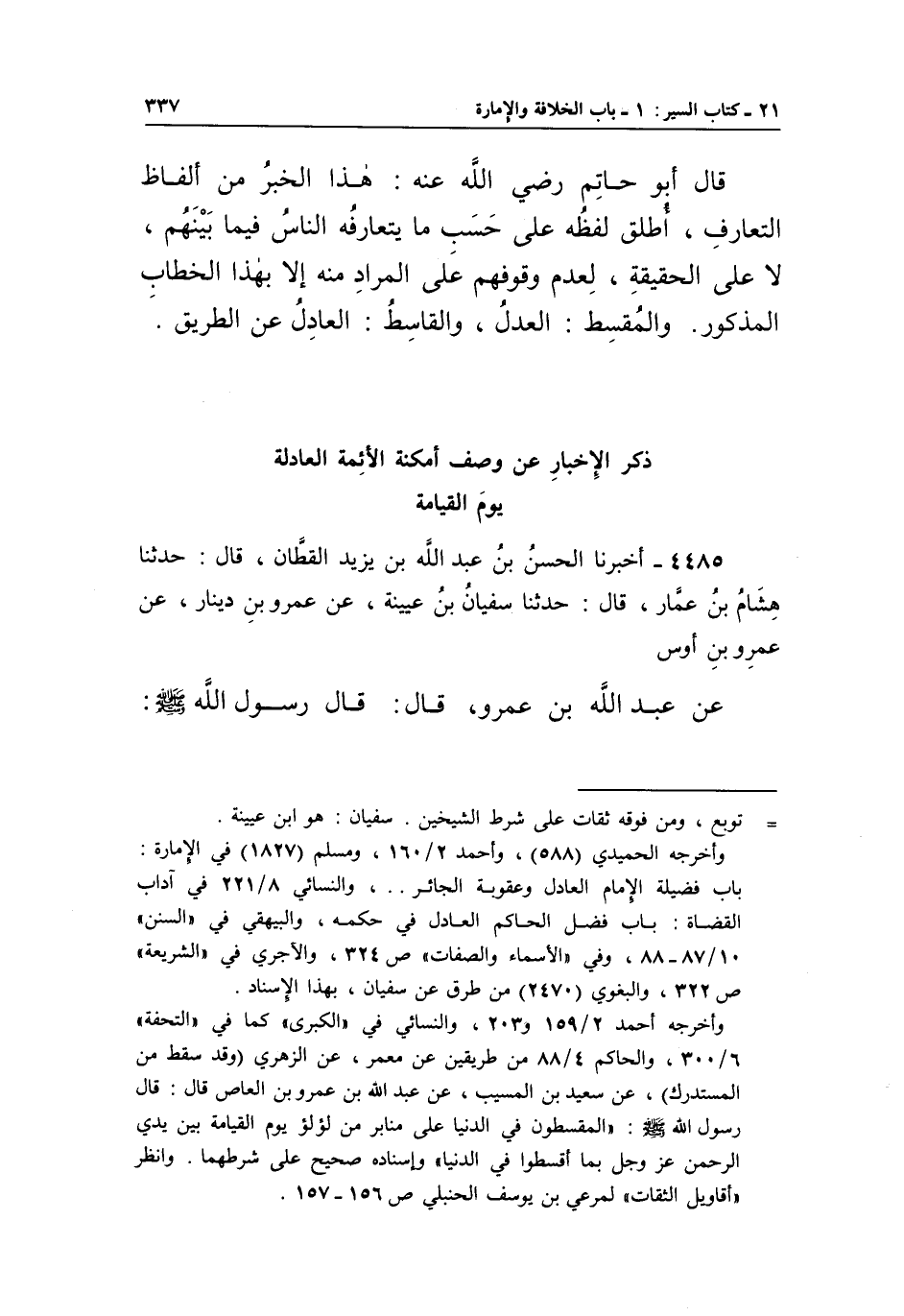 4485 - أَخْبَرَنَا الْحَسَنُ بْنُ عَبْدِ اللَّهِ بْنِ يَزِيدَ الْقَطَّانُ، قَالَ: حَدَّثَنَا هِشَامُ بْنُ عَمَّارٍ، قَالَ: حَدَّثَنَا سُفْيَانُ بْنُ عُيَيْنَةَ، عَنْ عَمْرِو بْنِ دِينَارٍ، عَنْ عَمْرِو بْنِ أَوْسٍ عَنْ عَبْدِ اللَّهِ بْنِ عَمْرٍو، قَالَ: قَالَ رَسُولُ اللَّهِ صَلَّى اللَّهُ عَلَيْهِ وَسَلَّمَ: