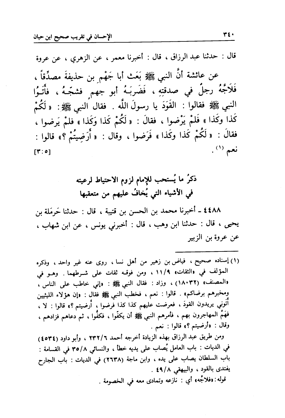 قَالَ: حَدَّثَنَا عَبْدُ الرَّزَّاقِ، قَالَ: أَخْبَرَنَا مَعْمَرٌ، عَنِ الزُّهْرِيِّ، عَنْ عُرْوَةَ عَنْ عَائِشَةَ أَنَّ النَّبِيَّ صَلَّى اللَّهُ عَلَيْهِ وَسَلَّمَ بَعَثَ أَبَا جَهْمِ بْنِ حُذَيْفَةَ مُصَدِّقًا، فَلَاجَّهُ رَجُلٌ فِي صَدَقَتِهِ، فَضَرَبَهُ أَبُو جَهْمٍ فَشَجَّهُ، فَأَتَوَا النَّبِيَّ صَلَّى اللَّهُ عَلَيْهِ وَسَلَّمَ فَقَالُوا: الْقَوَدُ يَا رَسُولَ اللَّهَ، فَقَالَ النَّبِيُّ صَلَّى اللَّهُ عَلَيْهِ وَسَلَّمَ: "لَكُمْ كَذَا وَكَذَا" فَلَمْ يَرْضَوْا، فَقَالَ: "لَكُمْ كَذَا وَكَذَا" فَلَمْ يَرْضَوْا، فَقَالَ: "لَكُمْ كَذَا وَكَذَا" فَرَضُوا، وَقَالَ: "أَرَضِيتُمْ؟ " قَالُوا: نَعَمْ1.