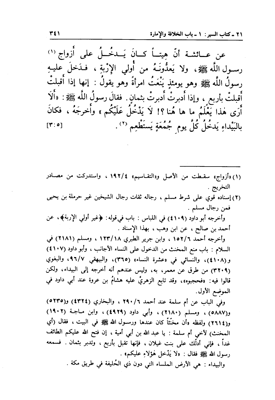عَنْ عَائِشَةَ أَنَّ هِيتًا كَانَ يَدْخُلُ عَلَى أزواج1 رَسُولُ اللَّهِ صَلَّى اللَّهُ عَلَيْهِ وَسَلَّمَ، وَلَا يَعُدُّونَهُ مِنْ أُولِي الْإِرْبَةِ، فَدَخَلَ عَلَيْهِ رَسُولِ اللَّهِ صَلَّى اللَّهُ عَلَيْهِ وَسَلَّمَ وَهُوَ يَوْمَئِذٍ يَنْعَتُ امْرَأَةً وَهُوَ يَقُولُ: إِنَّهَا إِذَا أَقْبَلَتْ أَقْبَلَتْ بِأَرْبَعٍ، وَإِذَا أَدْبَرَتْ أَدْبَرَتْ بِثَمَانٍ، فَقَالَ رَسُولُ اللَّهِ صَلَّى اللَّهُ عَلَيْهِ وَسَلَّمَ: "أَلَا أَرَى هَذَا يَعْلَمُ مَا هَا هُنَا؟! لَا يَدْخُلُ عَلَيْكُمْ" وَأَخْرَجَهُ، فَكَانَ بِالْبَيْدَاءِ يَدْخُلُ كل يوم جمعة يستطعم2.