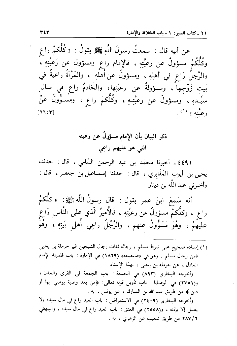 4491 - أَخْبَرَنَا مُحَمَّدُ بْنُ عَبْدِ الرَّحْمَنِ السَّامِيُّ، قَالَ: حَدَّثَنَا يَحْيَى بْنُ أَيُّوبَ الْمَقَابِرِيُّ، قَالَ: حَدَّثَنَا إِسْمَاعِيلُ بْنُ جَعْفَرٍ، قَالَ: وَأَخْبَرَنِي عَبْدُ اللَّهِ بْنُ دِينَارٍ أَنَّهُ سمع بْنَ عُمَرَ يَقُولُ: قَالَ رَسُولُ اللَّهِ صَلَّى اللَّهُ عَلَيْهِ وَسَلَّمَ: "كُلُّكُمْ رَاعٍ، وَكُلُّكُمْ مَسْؤُولٌ عَنْ رَعِيَّتِهِ، فَالْأَمِيرُ الَّذِي عَلَى النَّاسِ رَاعٍ عَلَيْهِمْ، وَهُوَ مَسْؤُولٌ عَنْهُمْ، وَالرَّجُلُ رَاعِي أَهْلَ بَيْتِهِ، وهو