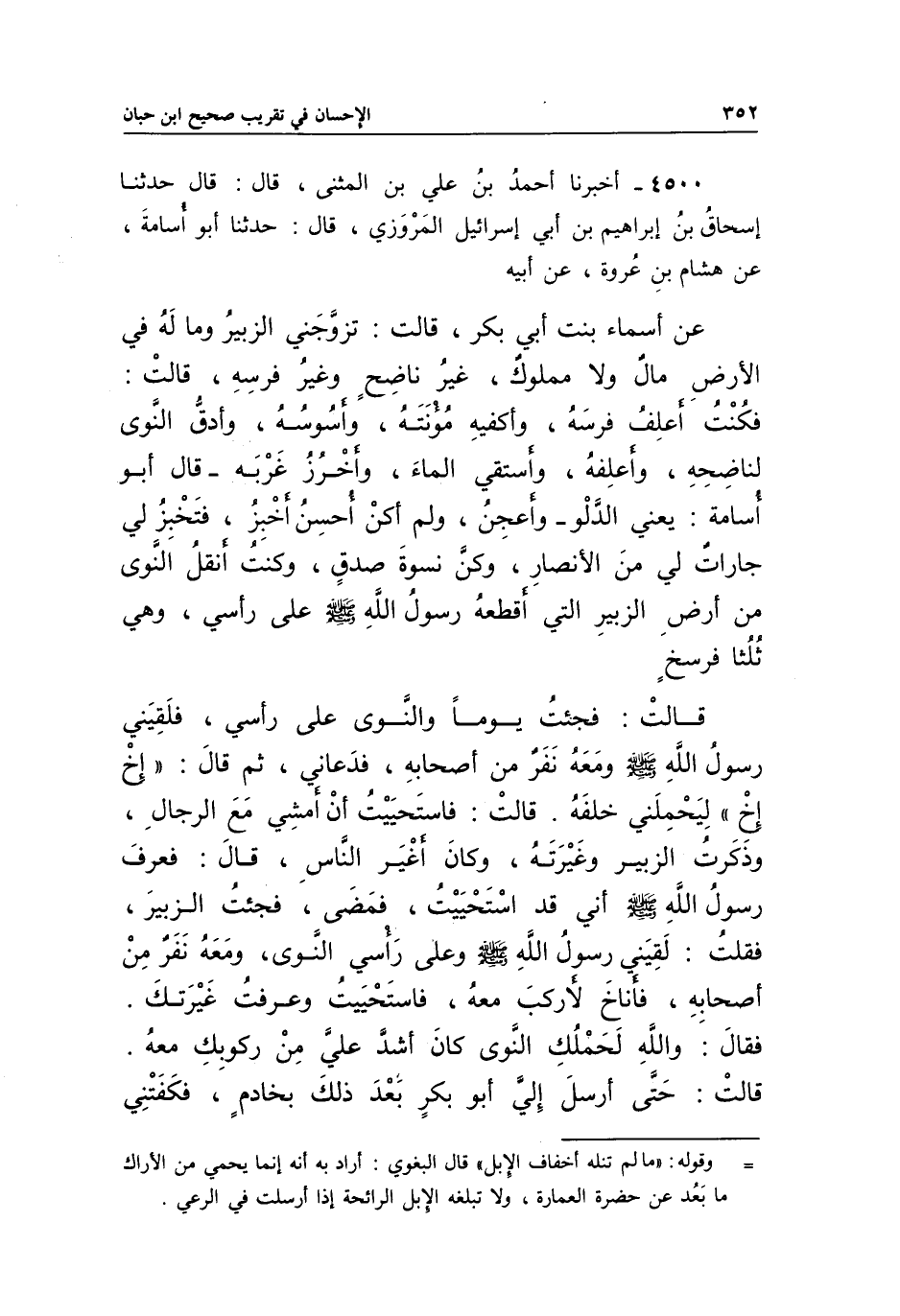 قَالَتْ: فَجِئْتُ يَوْمًا وَالنَّوَى عَلَى رَأْسِي، فَلَقِيَنِي رَسُولِ اللَّهِ صَلَّى اللَّهُ عَلَيْهِ وَسَلَّمَ وَمَعَهُ نَفَرٌ مِنْ أَصْحَابِهِ، فَدَعَانِي، ثُمَّ قَالَ: "إِخْ إِخْ" لِيَحْمِلَنِي خَلْفَهُ، قَالَتْ: فَاسْتَحْيَيْتُ أَنْ أَمْشِيَ مَعَ الرِّجَالِ، وَذَكَرْتُ الزُّبَيْرَ وَغَيْرَتَهُ، وَكَانَ أَغْيَرُ النَّاسِ، قَالَ: فَعَرَفَ رَسُولُ اللَّهِ صَلَّى اللَّهُ عَلَيْهِ وَسَلَّمَ إِنِّي قَدِ اسْتَحْيَيْتُ، فَمَضَى، فَجِئْتُ الزُّبَيْرَ، فَقُلْتُ: لَقِيَنِي رَسُولُ اللَّهِ صَلَّى اللَّهُ عَلَيْهِ وَسَلَّمَ وَعَلَى رَأْسِي النَّوَى، وَمَعَهُ نَفَرٌ مِنْ أَصْحَابِهِ، فَأَنَاخَ لِأَرْكَبَ مَعَهُ، فَاسْتَحْيَيْتُ وَعَرَفْتُ غَيْرَتَكَ. فَقَالَ: وَاللَّهِ لَحَمْلُكِ النَّوَى كَانَ أَشَدَّ عَلَيَّ مِنْ رُكُوبِكِ مَعَهُ. قَالَتْ: حَتَّى أَرْسَلَ إِلَيَّ أَبُو بَكْرٍ بَعْدَ ذَلِكَ بِخَادِمٍ، فَكَفَتْنِي