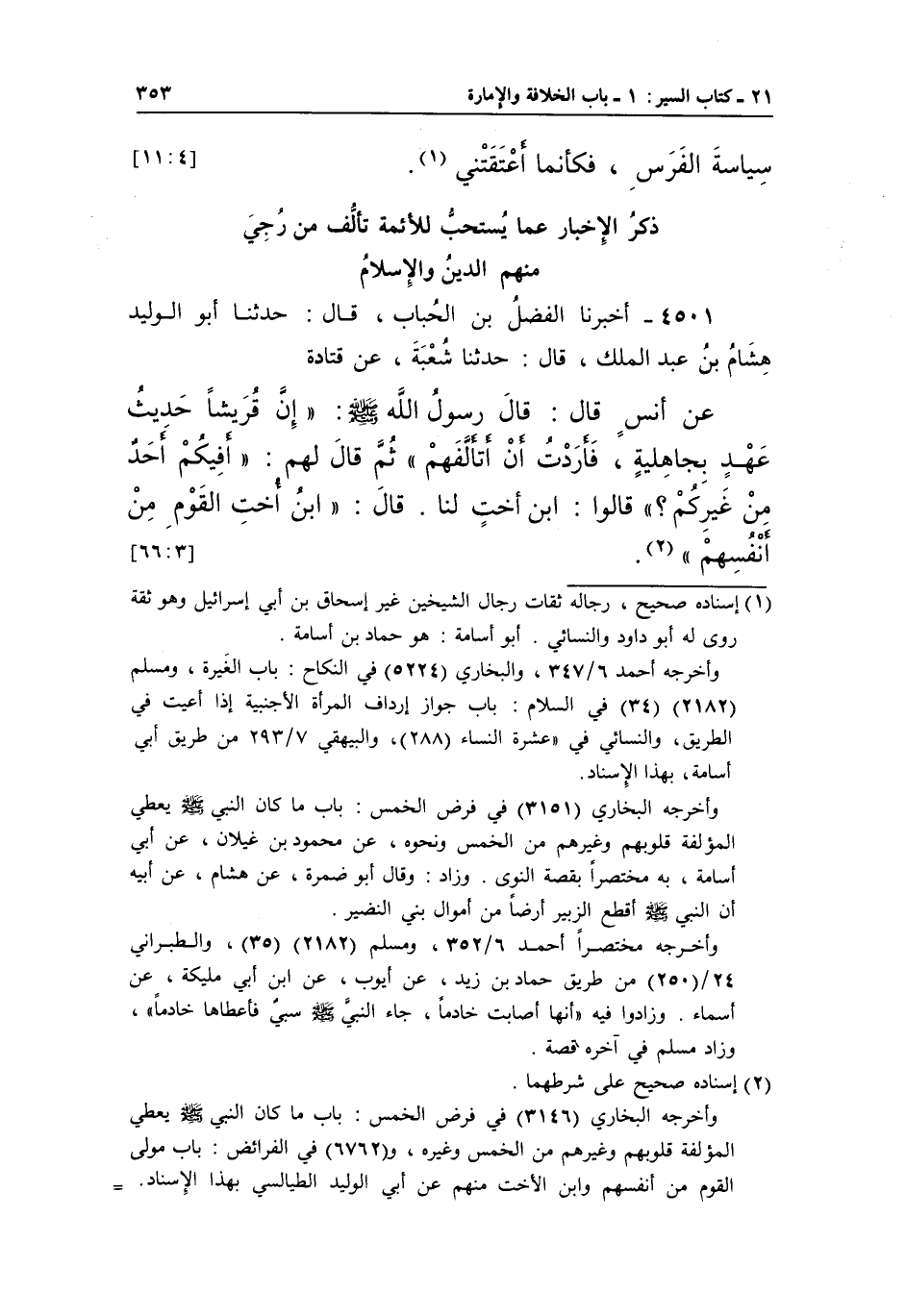 4501 - أَخْبَرَنَا الْفَضْلُ بْنُ الْحُبَابِ، قَالَ: حَدَّثَنَا أَبُو الْوَلِيدِ هِشَامُ بْنُ عَبْدِ الْمَلِكِ، قَالَ: حَدَّثَنَا شُعْبَةُ، عَنْ قَتَادَةَ عَنْ أَنَسِ قَالَ: قَالَ رَسُولُ اللَّهِ صَلَّى اللَّهُ عَلَيْهِ وَسَلَّمَ: "إِنَّ قُرَيْشًا حَدِيثُ عَهْدٍ بِجَاهِلِيَّةٍ، فَأَرَدْتُ أَنْ أَتَأَلَّفَهُمْ" ثُمَّ قَالَ لَهُمْ: "أَفِيكُمْ أَحَدٌ مِنْ غَيْرِكُمْ" قَالُوا: ابْنُ أُخْتٍ لَنَا، قَالَ: "ابْنُ أُخْتِ الْقَوْمِ مِنْ أَنْفُسِهِمْ" 1.