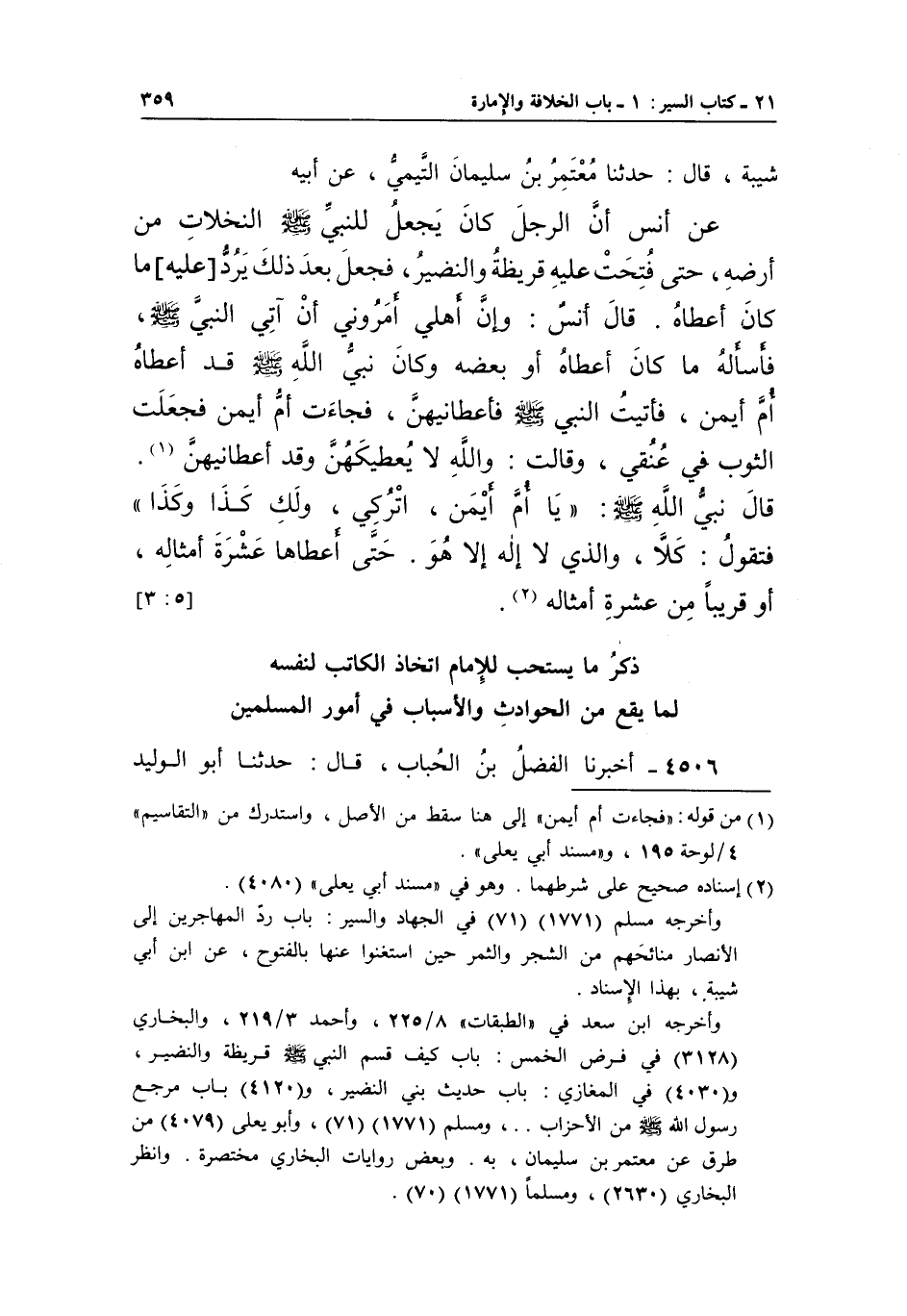 4505 - أَخْبَرَنَا أَبُو يَعْلَى بالموصل، قال: حدثنا أبو بكر بن أبيشيبة، قَالَ: حَدَّثَنَا مُعْتَمِرُ بْنُ سُلَيْمَانَ التَّيْمِيُّ، عَنْ أبيه عن أنس أن رجلا كَانَ يَجْعَلُ لِلنَّبِيِّ صَلَّى اللَّهُ عَلَيْهِ وَسَلَّمَ النَّخَلَاتِ مِنْ أَرْضِهِ، حَتَّى فُتِحَتْ عَلَيْهِ قُرَيْظَةُ وَالنَّضِيرُ، فَجَعَلَ بَعْدَ ذَلِكَ يَرُدُّ [عَلَيْهِ] مَا كَانَ أَعْطَاهُ. قَالَ أَنَسٌ: وَإِنَّ أَهْلِي أَمَرُونِي أَنْ آتِيَ النَّبِيَّ صَلَّى اللَّهُ عَلَيْهِ وَسَلَّمَ، فَأَسْأَلَهُ مَا كَانَ أَعْطَاهُ أَوْ بَعْضَهُ وَكَانَ نَبِيُّ اللَّهِ صَلَّى اللَّهُ عَلَيْهِ وَسَلَّمَ قَدْ أَعْطَاهُ أُمَّ أَيْمَنَ، فَأَتَيْتُ النَّبِيَّ صَلَّى اللَّهُ عَلَيْهِ وَسَلَّمَ فَأَعْطَانِيهِنَّ، فَجَاءَتْ أُمُّ أَيْمَنَ فَجَعَلَتِ الثَّوْبَ فِي عُنُقِي، وَقَالَتْ: وَاللَّهِ لَا يُعْطِيكَهُنَّ وَقَدْ أَعْطَانِيهُنَّ1. قَالَ نَبِيُّ اللَّهِ صَلَّى اللَّهُ عَلَيْهِ وَسَلَّمَ: "يَا أُمَّ أَيْمَنَ اتْرُكِي، وَلَكِ كَذَا وَكَذَا" فَتَقُولُ: كَلَّا، وَالَّذِي لَا إِلَهَ إِلَّا هُوَ. حَتَّى أَعْطَاهَا عَشْرَةَ أَمْثَالِهِ، أَوْ قريبا من عشرة أمثاله2.