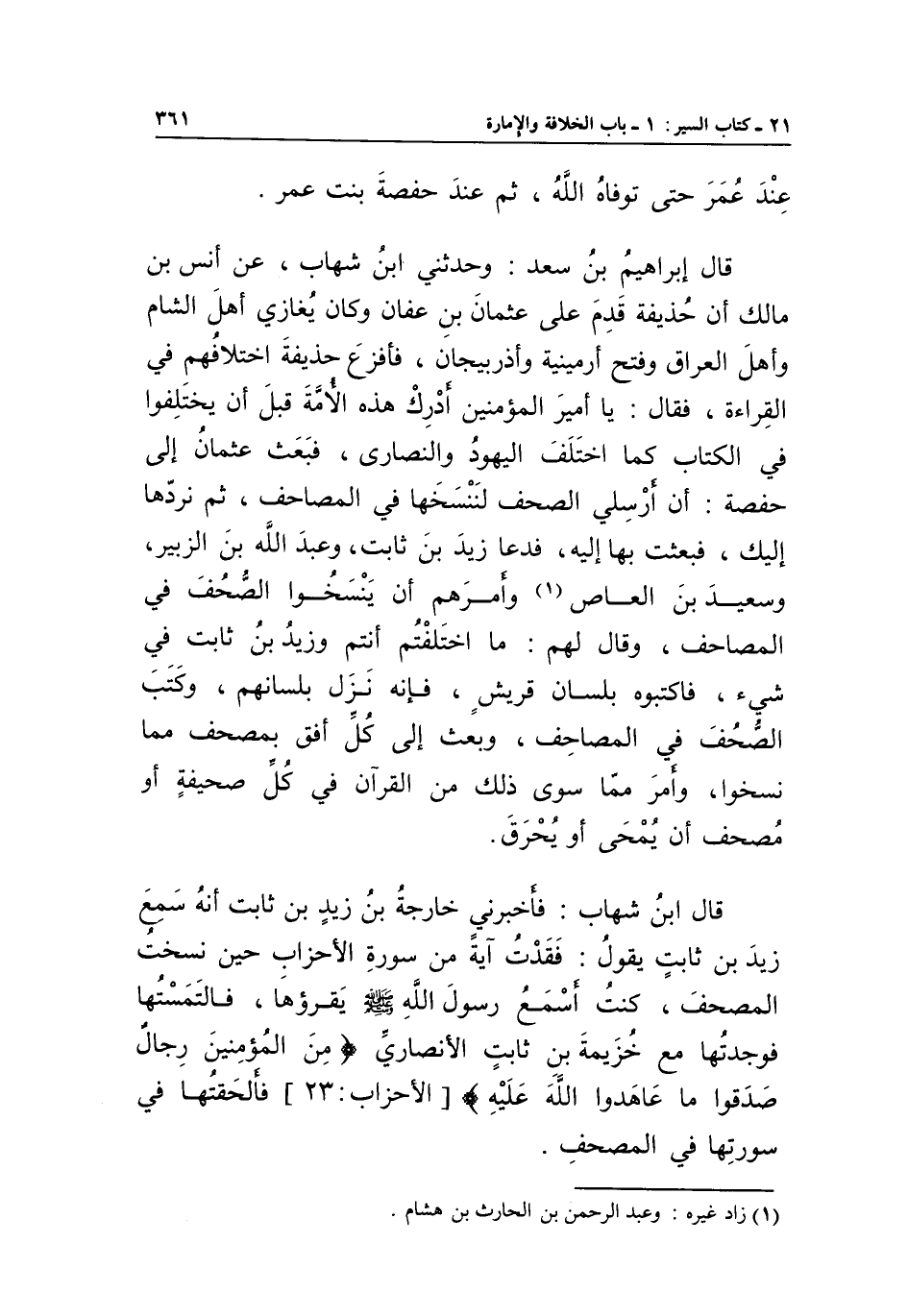 قَالَ ابْنُ شِهَابٍ: فَأَخْبَرَنِي خَارِجَةُ بْنُ زَيْدِ بْنِ ثَابِتٍ أَنَّهُ سَمِعَ زَيْدَ بْنَ ثَابِتٍ يَقُولُ: فَقَدْتُ آيَةً مِنْ سُورَةِ الْأَحْزَابِ حِينَ نَسَخْتُ الْمُصْحَفَ، كُنْتُ أَسْمَعُ رَسُولَ اللَّهِ صَلَّى اللَّهُ عَلَيْهِ وَسَلَّمَ يَقْرَؤُهَا، فَالْتَمَسْتُهَا فَوَجَدْتُهَا مَعَ خُزَيْمَةَ بْنَ ثَابِتٍ الْأَنْصَارِيِّ {مِنَ الْمُؤْمِنِينَ رِجَالٌ صَدَقُوا مَا عَاهَدُوا اللَّهَ عَلَيْهِ} [الأحزاب:23] فَأَلْحَقْتُهَا في سورتها في المصحف.