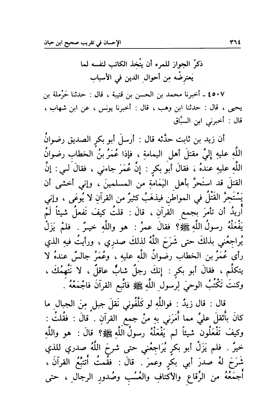 4507 - أَخْبَرَنَا مُحَمَّدُ بْنُ الْحَسَنِ بْنِ قُتَيْبَةَ، قَالَ: حَدَّثَنَا حَرْمَلَةُ بْنُ يَحْيَى، قَالَ: حَدَّثَنَا ابْنُ وَهْبٍ، قَالَ: أَخْبَرَنَا يُونُسُ، عَنِ ابْنِ شِهَابٍ، قَالَ: أَخْبَرَنِي ابْنُ السَّبَّاقِ أَنَّ زَيْدَ بْنَ ثَابِتٍ حَدَّثَهُ قَالَ: أَرْسَلَ أَبُو بَكْرٍ الصِّدِّيقُ رِضْوَانُ اللَّهِ عَلَيْهِ إِلَيَّ مَقْتَلَ أَهْلِ الْيَمَامَةِ، فَإِذَا عُمَرُ بْنُ الْخَطَّابِ رِضْوَانُ اللَّهِ عَلَيْهِ عِنْدَهُ، فَقَالَ أَبُو بَكْرٍ: إِنَّ عُمَرَ جَاءَنِي فَقَالَ لِي: إِنَّ الْقَتْلَ قَدِ اسْتَحَرَّ بِأَهْلِ الْيَمَامَةِ مِنَ الْمُسْلِمِينَ، وَإِنِّي أَخْشَى أَنْ يَسْتَحِرَّ الْقَتْلُ فِي الْمَوَاطِنِ فَيَذْهَبُ كَثِيرٌ مِنَ الْقُرْآنِ لَا يُوعَى، وَإِنِّي أُرِيدُ أَنْ تَأْمُرَ بِجَمْعِ الْقُرْآنِ، قَالَ: قُلْتُ: كَيْفَ تَفْعَلُ شَيْئًا لَمْ يَفْعَلْهُ رَسُولُ اللَّهِ صَلَّى اللَّهُ عَلَيْهِ وَسَلَّمَ؟ فَقَالَ عُمَرُ: هُوَ وَاللَّهِ خَيْرٌ. فَلَمْ يَزَلْ يُرَاجِعُنِي بِذَلِكَ حَتَّى شَرَحَ اللَّهُ لِذَلِكَ صَدْرِي، وَرَأَيْتُ فِيهِ الَّذِي رَأَى عُمَرُ بْنُ الْخَطَّابِ رِضْوَانُ اللَّهِ عَلَيْهِ، وَعُمَرُ جَالِسٌ عِنْدَهُ لَا يَتَكَلَّمُ، فَقَالَ أَبُو بَكْرٍ: إِنَّكَ رَجُلٌ شَابٌّ عَاقِلٌ، لَا نَتَّهِمُكَ، وَكُنْتَ تُكْتَبُ الْوَحْيَ لِرَسُولِ اللَّهِ صَلَّى اللَّهُ عَلَيْهِ وَسَلَّمَ فَاتَّبِعِ الْقُرْآنَ فَاجْمَعْهُ.