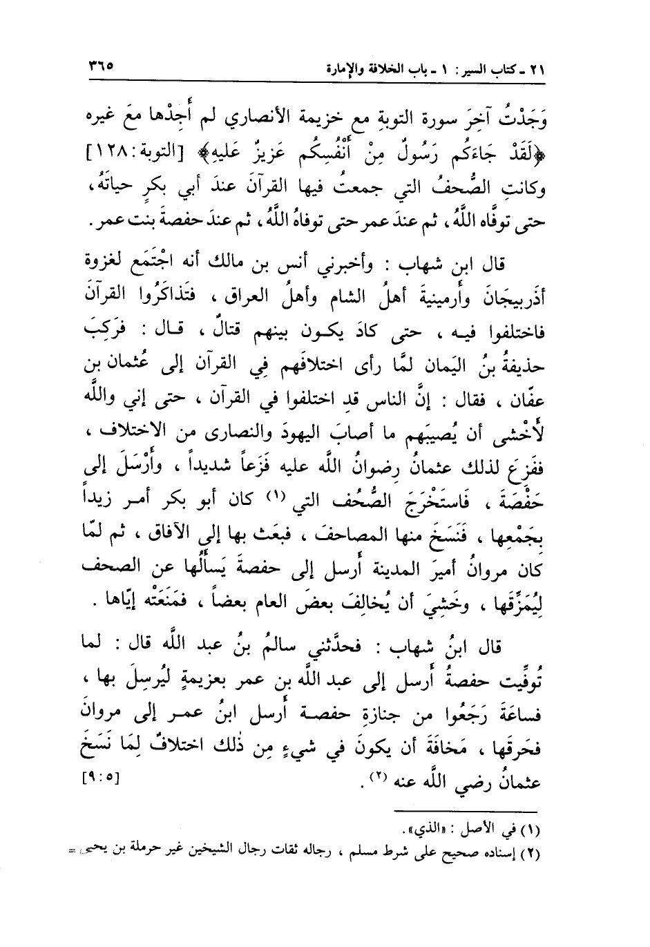 قَالَ ابْنُ شِهَابٍ: وَأَخْبَرَنِي أَنَسُ بْنُ مَالِكٍ أَنَّهُ اجْتَمَعَ لِغَزْوَةِ أَذْرِبِيجَانَ وَأَرْمِينِيَةَ أَهْلِ الشَّامِ وَأَهْلِ الْعِرَاقِ، فَتَذَاكَرُوا الْقُرْآنَ فَاخْتَلَفُوا فِيهِ، حَتَّى كَادَ يَكُونُ بَيْنَهُمْ قِتَالٌ، قَالَ: فَرَكِبَ حُذَيْفَةُ بْنُ الْيَمَانِ لَمَّا رَأَى اخْتِلَافَهُمْ فِي الْقُرْآنِ إِلَى عُثْمَانَ بْنِ عَفَّانَ، فَقَالَ: إِنَّ النَّاسَ قَدِ اخْتَلَفُوا فِي الْقُرْآنِ، حَتَّى إِنِّي وَاللَّهِ لَأَخْشَى أَنْ يُصِيبَهُمْ مَا أَصَابَ الْيَهُودَ وَالنَّصَارَى مِنَ الِاخْتِلَافِ، فَفَزِعَ لِذَلِكَ عُثْمَانُ رِضْوَانُ اللَّهِ عَلَيْهِ فَزِعًا شَدِيدًا، وَأَرْسَلَ إِلَى حَفْصَةَ، فَاسْتَخْرَجَ الصُّحُفَ الَّتِي1 كَانَ أَبُو بَكْرٍ أَمَرَ زَيْدًا بِجَمْعِهَا، فَنَسَخَ مِنْهَا الْمَصَاحِفَ، فَبَعَثَ بِهَا إِلَى الْآفَاقِ، ثُمَّ لَمَّا كَانَ مَرْوَانُ أَمِيرُ الْمَدِينَةِ أَرْسَلَ إِلَى حَفْصَةَ يَسْأَلُهَا عَنِ الصُّحُفِ لِيُمَزِّقَهَا، وَخَشِيَ أَنْ يُخَالِفَ بَعْضُ الْعَامِ بَعْضًا، فَمَنَعْتُهُ إِيَّاهَا.