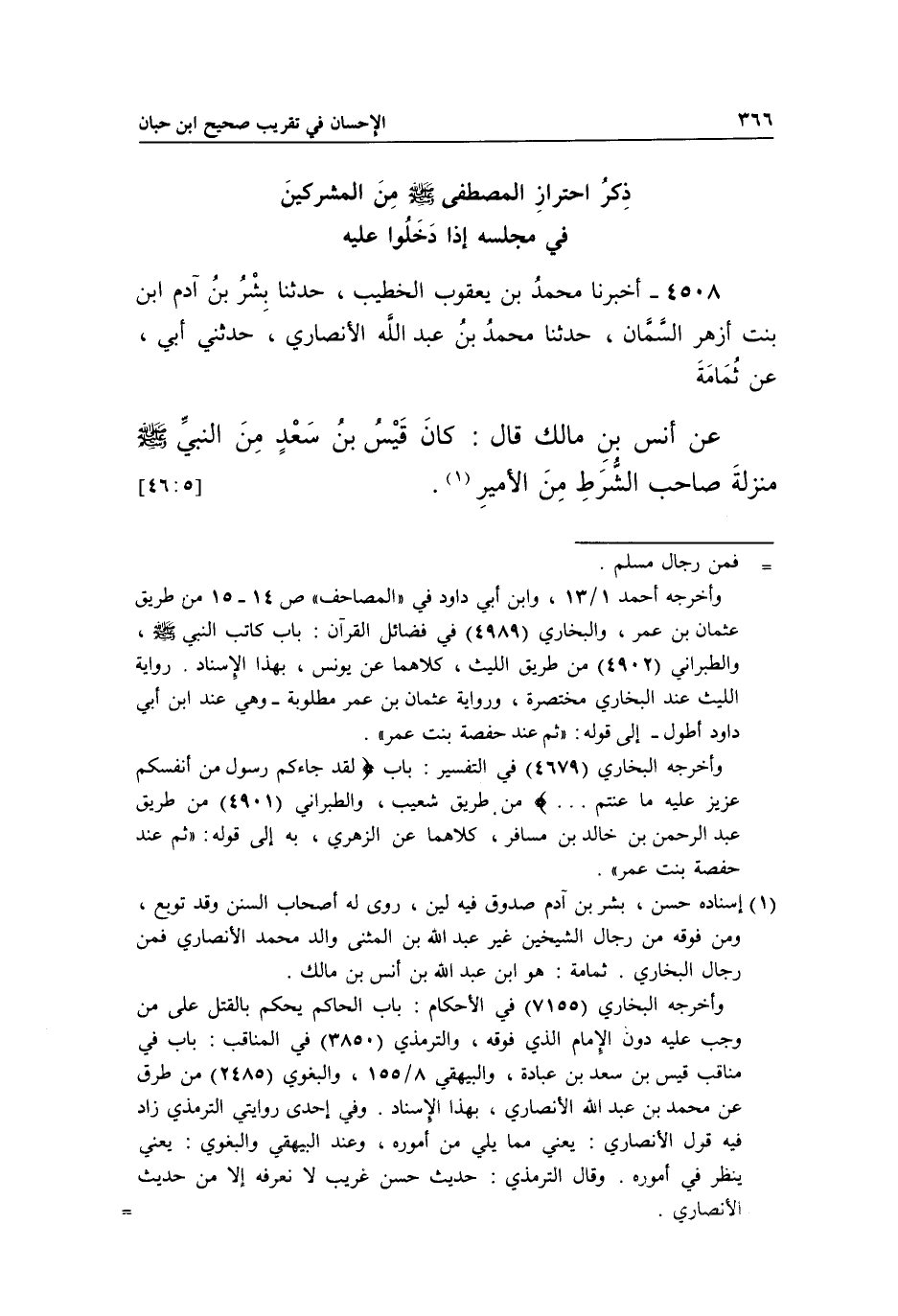 4508 - أَخْبَرَنَا مُحَمَّدُ بْنُ يَعْقُوبَ الْخَطِيبُ، حَدَّثَنَا بِشْرُ بْنُ آدَمَ بْنِ بِنْتِ أَزْهَرَ السَّمَّانُ، حَدَّثَنَا مُحَمَّدُ بْنُ عَبْدِ اللَّهِ الْأَنْصَارِيُّ، حَدَّثَنِي أَبِي، عَنْ ثُمَامَةَ عَنْ أَنَسِ بْنِ مَالِكٍ قَالَ: كَانَ قَيْسُ بْنُ سَعْدٍ مِنَ النَّبِيِّ صَلَّى اللَّهُ عَلَيْهِ وَسَلَّمَ مَنْزِلَةَ صَاحِبِ الشَّرَطِ مِنَ الأمير1.