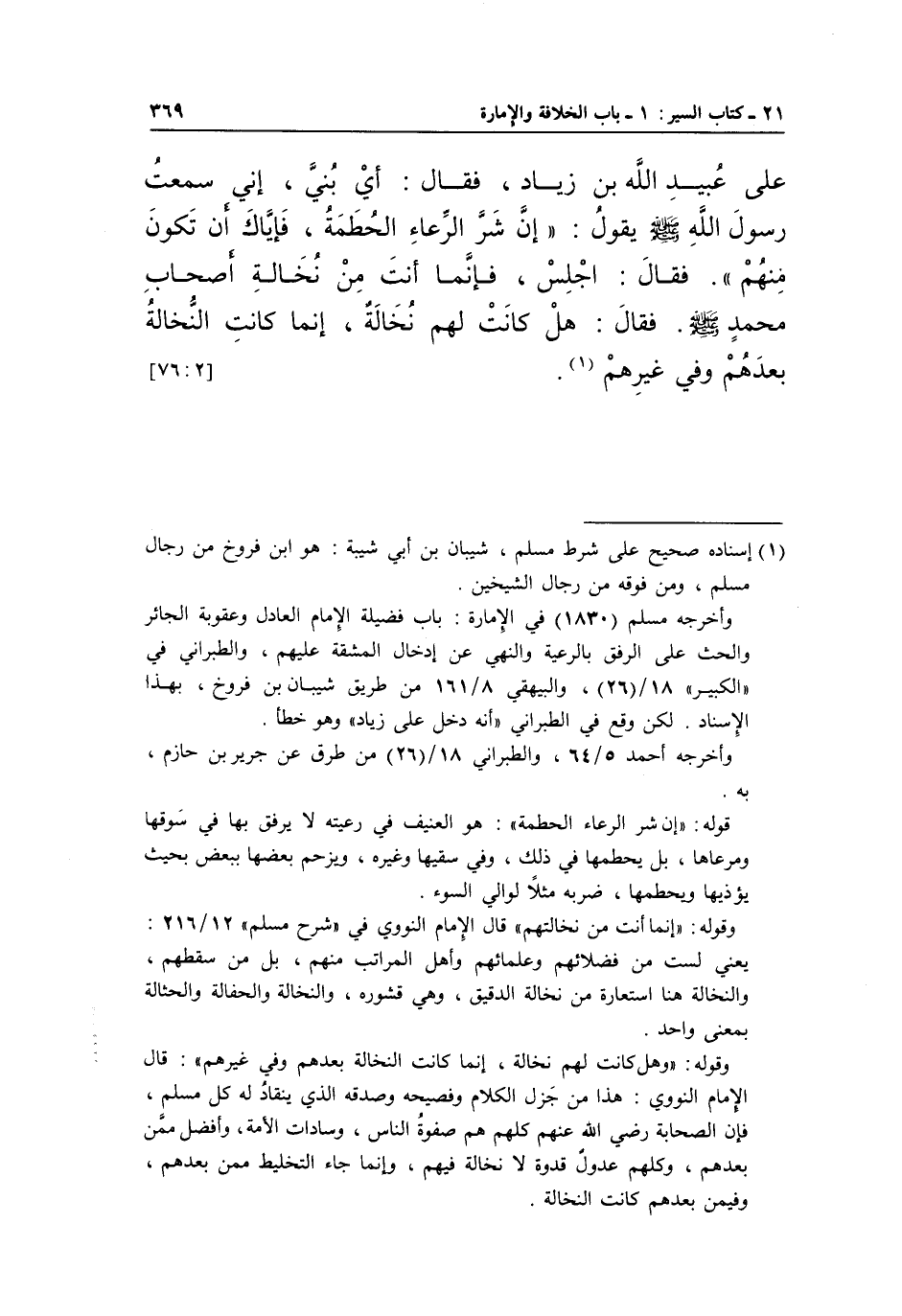 عَلَى عُبَيْدِ اللَّهِ بْنِ زِيَادٍ، فَقَالَ: أَيْ بُنَيَّ، إِنِّي سَمِعْتُ رَسُولَ اللَّهِ صَلَّى اللَّهُ عَلَيْهِ وَسَلَّمَ يَقُولُ: "إِنَّ شَرَّ الرِّعَاءِ الْحُطَمَةُ، فَإِيَّاكَ أَنْ تَكُونَ مِنْهُمْ". فَقَالَ: اجْلِسْ، فَإِنَّمَا أَنْتَ مِنْ نُخَالَةِ أَصْحَابِ مُحَمَّدٍ صَلَّى اللَّهُ عَلَيْهِ وَسَلَّمَ، فَقَالَ: هَلْ كَانَتْ لَهُمْ نُخَالَةٌ، إنما كانت النخالة بعدهم وفي غيرهم1.