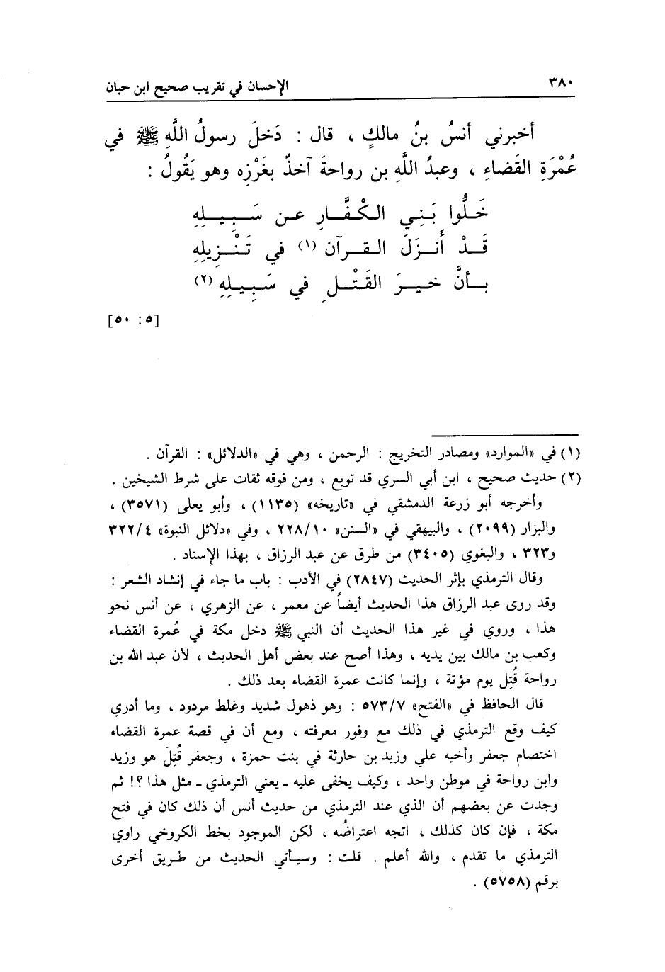 وقال الترمذي بإثر الحديث 2847 في الأدب: باب ما جاء في إسناد الشعر: وقد روى عبد الرزاق هذا الحديث أيضاً عن معمر، عن الزهري، عن أنس نحو هذا، وروي في غير هذا الحديث أن النبي صلى الله عليه وسلم دخل مكة في عُمرة القضاء وكعب بن مالك بين يديه، وهذا أصح عند بعض أهل الحديث، لأن عبد الله بن رواحة قُتِل يوم مؤتة، وإنما كانت عمرة القضاء بعد ذلك.