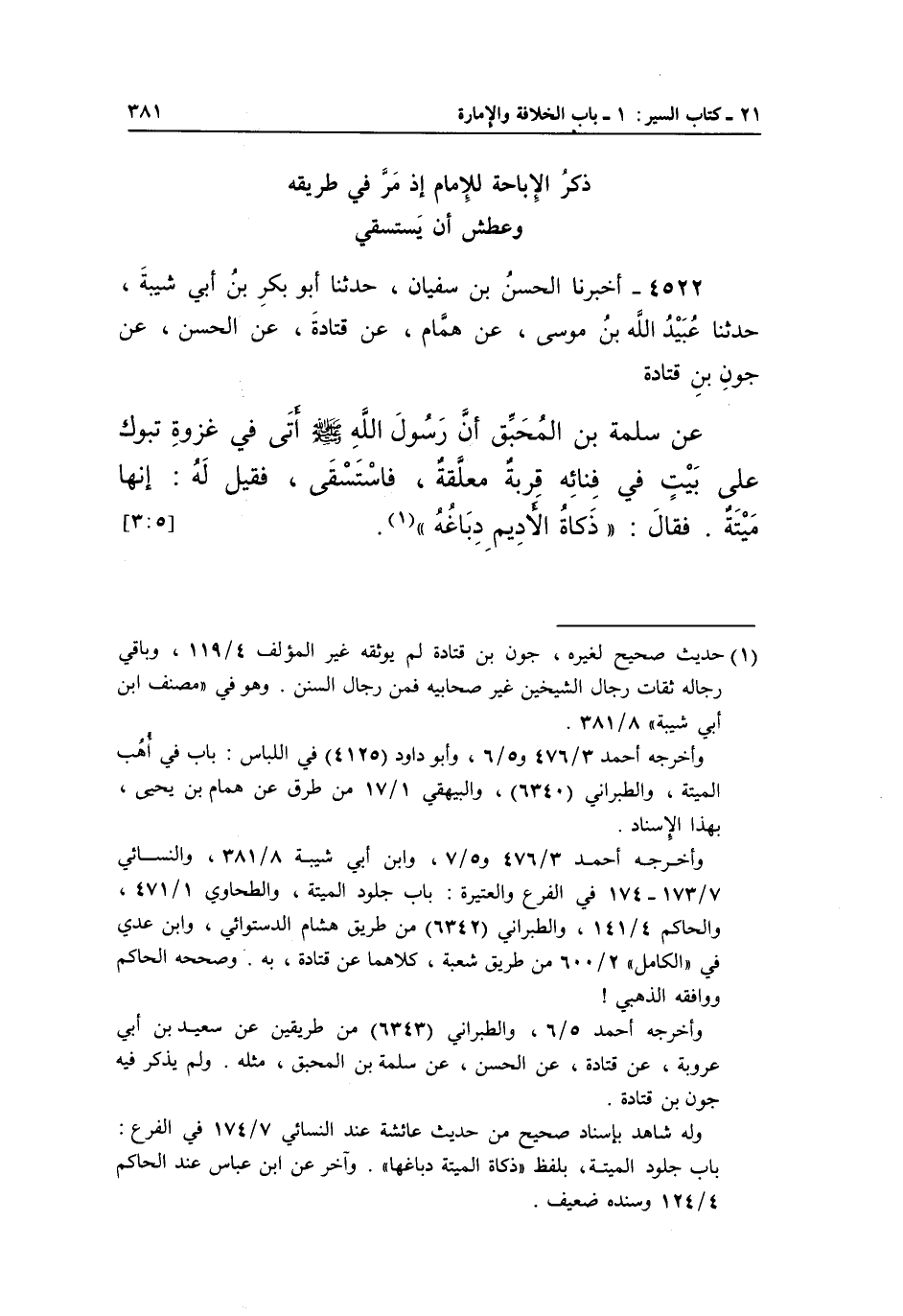 4522 - أَخْبَرَنَا الْحَسَنُ بْنُ سُفْيَانَ، حَدَّثَنَا أَبُو بَكْرِ بْنُ أَبِي شَيْبَةَ، حَدَّثَنَا عُبَيْدُ اللَّهِ بْنُ مُوسَى، عَنْ هَمَّامٍ، عَنْ قَتَادَةَ، عَنِ الْحَسَنِ، عَنْ جَوْنِ بْنِ قَتَادَةَ عَنْ سَلَمَةَ بْنِ الْمُحَبِّقِ أَنَّ رَسُولَ اللَّهِ صَلَّى اللَّهُ عَلَيْهِ وَسَلَّمَ أَتَى فِي غَزْوَةِ تَبُوكَ عَلَى بَيْتٍ فِي فِنَائِهِ قِرْبَةٌ مُعَلَّقَةٌ، فَاسْتَسْقَى، فَقِيلَ لَهُ: إِنَّهَا مَيْتَةٌ. فَقَالَ: "ذَكَاةُ الأديم دباغه" 1.