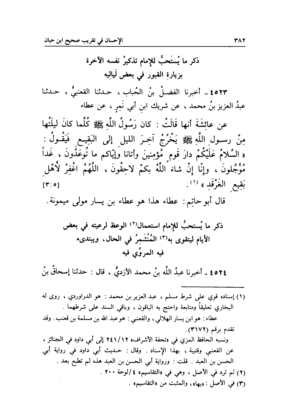 ذِكْرُ مَا يُسْتَحَبُّ لِلْإِمَامِ تَذْكِيرُ نَفْسِهِ الْآخِرَةَ بِزِيَارَةِ الْقُبُورِ فِي بَعْضِ لَيَالِيهِ