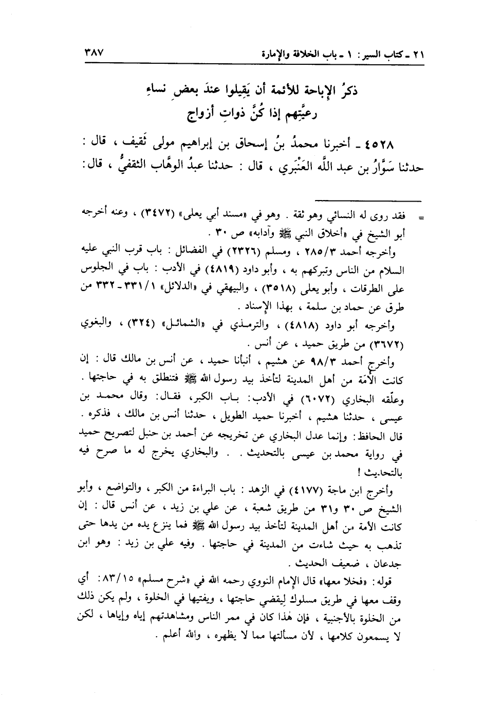 وأخرج أحمد 3/98 عن هشيم، أنبأنا حميد، عن أنس بن مالك قال: إن كانت الأمَة من أهل المدينة لتأخذ بيد رسول الله صلى الله عليه وسلم فتنطلق به في حاجتها. وعلّقه البخاري 6072 في الأدب: باب الكبر، فقال: وقال محمد بن عيسى، حدثنا هشيم، أخبرنا حميد الطويل، حدثنا أنس بن مالك، فذكره. قال الحافظ: وإنما عدل البخاري عن تخريجه عن أحمد بن حنبل لتصريح حميد في رواية محمد بن عيسى بالتحديث ... والبخاري يخرج له ما صرح فيه بالتحديث!