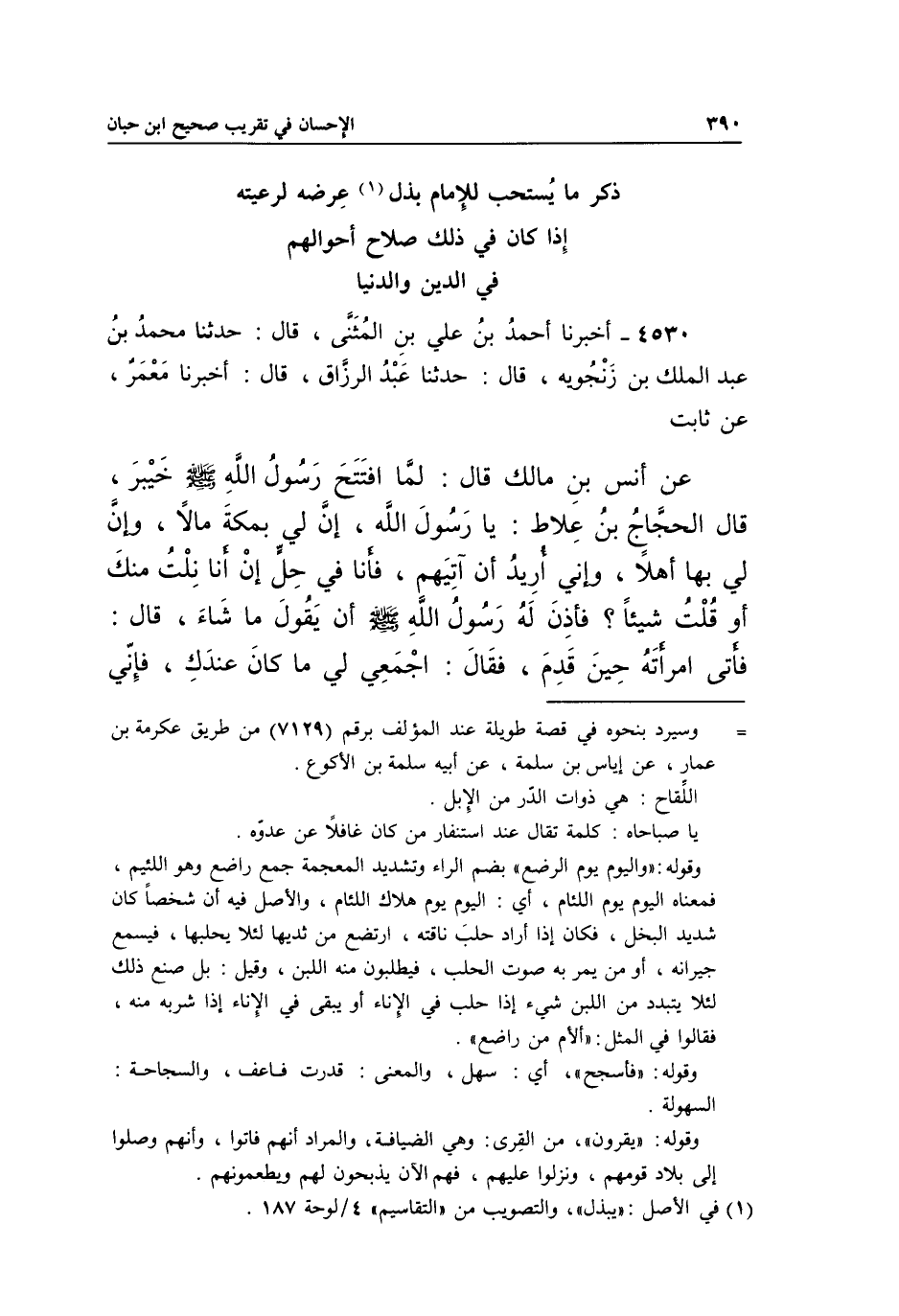 ذِكْرُ مَا يُسْتَحَبُّ لِلْإِمَامِ بَذْلُ1 عَرْضِهِ لِرَعِيَّتِهِ إِذَا كَانَ فِي ذَلِكَ صَلَاحُ أَحْوَالِهِمْ فِي الدِّينِ وَالدُّنْيَا