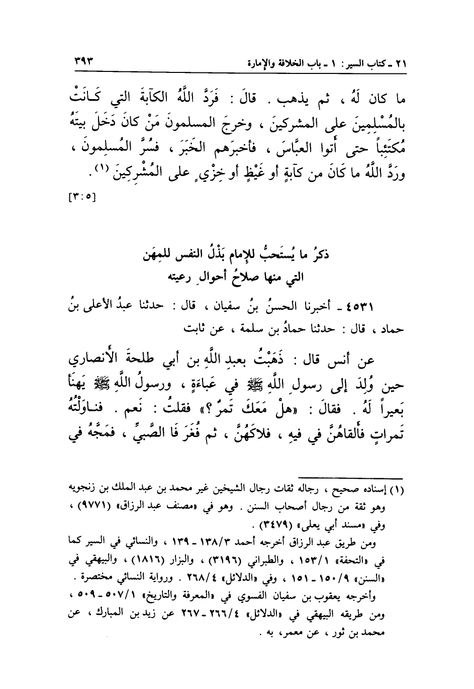 4531 - أَخْبَرَنَا الْحَسَنُ بْنُ سُفْيَانَ، قَالَ: حَدَّثَنَا عَبْدُ الْأَعْلَى بْنُ حَمَّادٍ، قَالَ: حَدَّثَنَا حَمَّادُ بْنُ سَلَمَةَ، عَنْ ثَابِتٍ عَنْ أَنَسٍ قَالَ: ذَهَبْتُ بِعَبْدِ اللَّهِ بْنِ أَبِي طَلْحَةَ الْأَنْصَارِيِّ حِينَ وُلِدَ إِلَى رَسُولِ اللَّهِ صَلَّى اللَّهُ عَلَيْهِ وَسَلَّمَ في عَبَاءَةٍ، وَرَسُولُ اللَّهِ صَلَّى اللَّهُ عَلَيْهِ وَسَلَّمَ يَهْنَأُ بَعِيرًا لَهُ. فَقَالَ: "هَلْ مَعَكَ تَمْرٌ؟ " فَقُلْتُ: نَعَمْ، فَنَاوَلْتُهُ تَمَرَاتٍ فَأَلْقَاهُنَّ فِي فِيهِ، فلاكهن، ثم فغر فا الصَّبِيِّ، فَمَجَّهُ فِي
